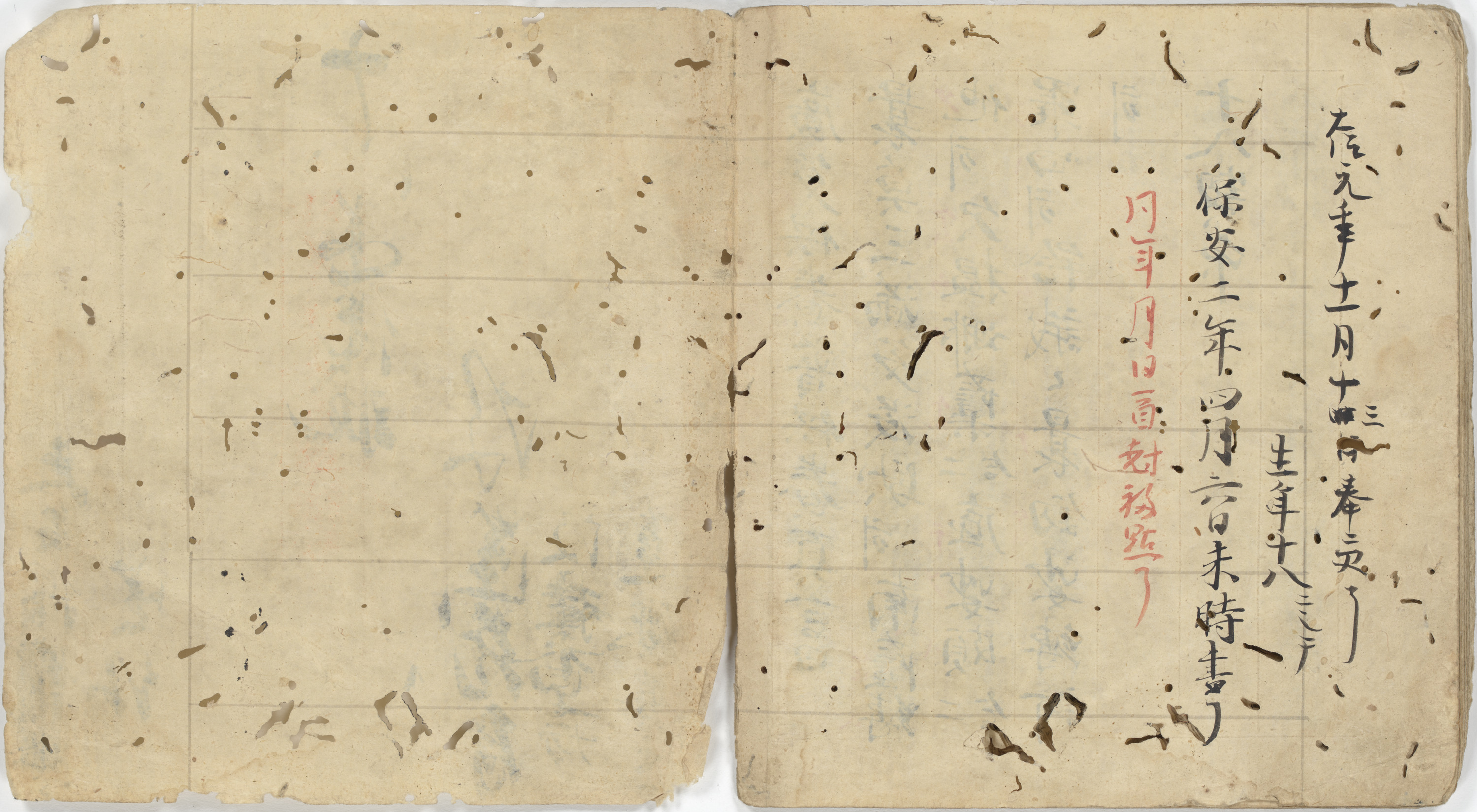 | 銘文/印章等 | 奥に「大治元年十一月十三日 奉交了 生年十八にして保安二年四月六日未時書了(朱) 同年日酉剋移点了」とあり |