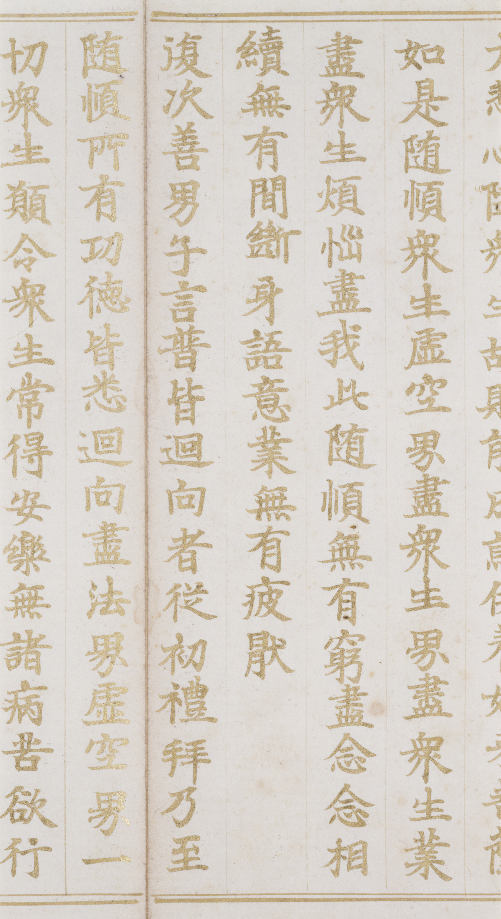 これは奥書によって元の世祖の至元二十八年(1291年)四月八日、経南山万寿禅寺の光明禅寺恵月の発願によって書写された大方応仏華厳経とわかる。元来紺紙金泥経で高麗のものは若干日本に伝来しているが、中国のもので年記の確かなものは極めて珍しい。また各巻の見返部分に金銀泥で密画変相が付いているが、この華厳経行願品見返絵の片隅に款記があって画工の名もわかり、書としては基より、絵画資料としても貴重である。