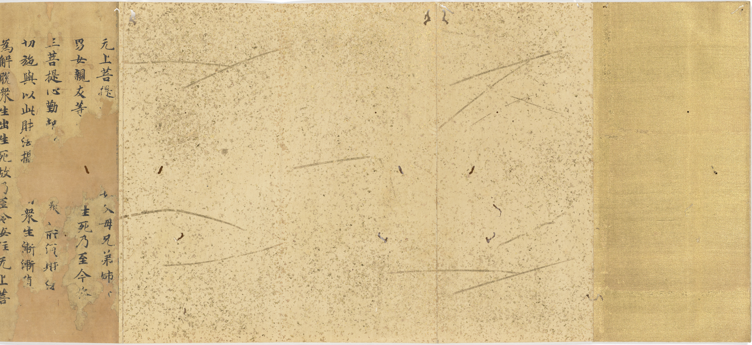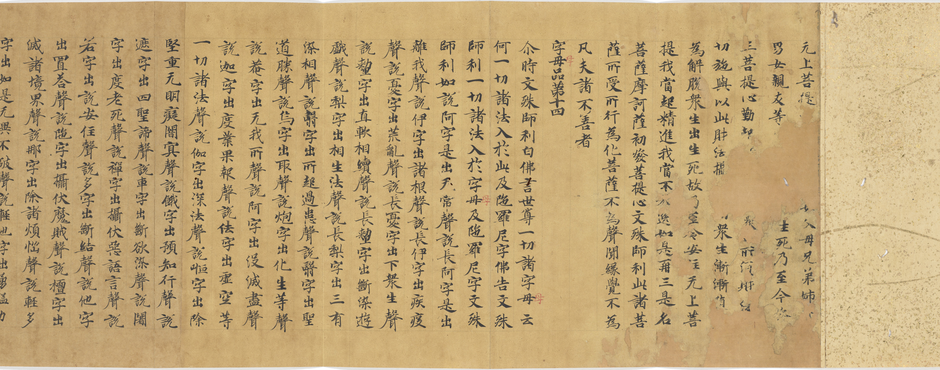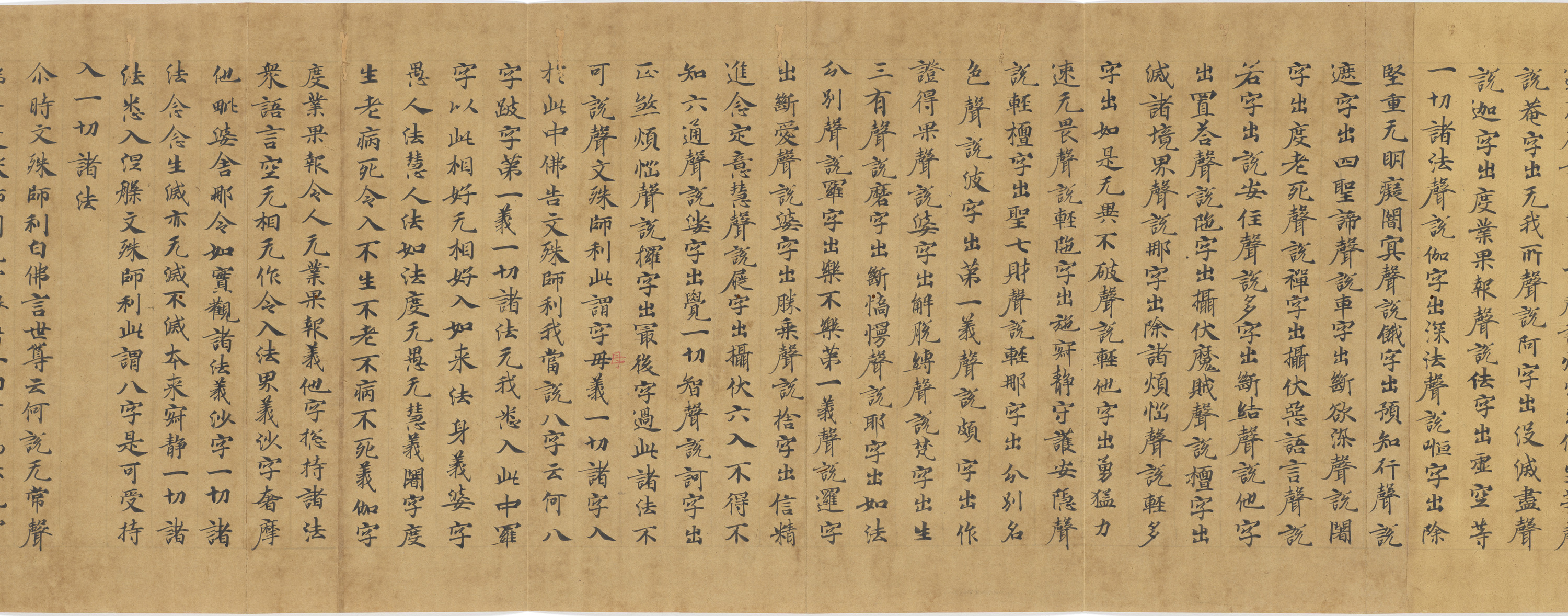 聖武天皇の后、光明皇后(七〇一~六〇)が父藤原不比等と母県犬養三千代のために書写させた一切経(仏典の一大集成)のうちの一巻。これらの経典は、奥書に「天平十二年(七四〇)五月一日記」とあることから、「五月一日経」と呼ばれる。経文の書写には兎の毛の筆、界線には鹿の毛の筆が使われた。経文が整然と列ぶ姿は圧巻であるが、これは「式」という目盛りの入った紙を目安として用いていたことが、写経所文書より知られている。