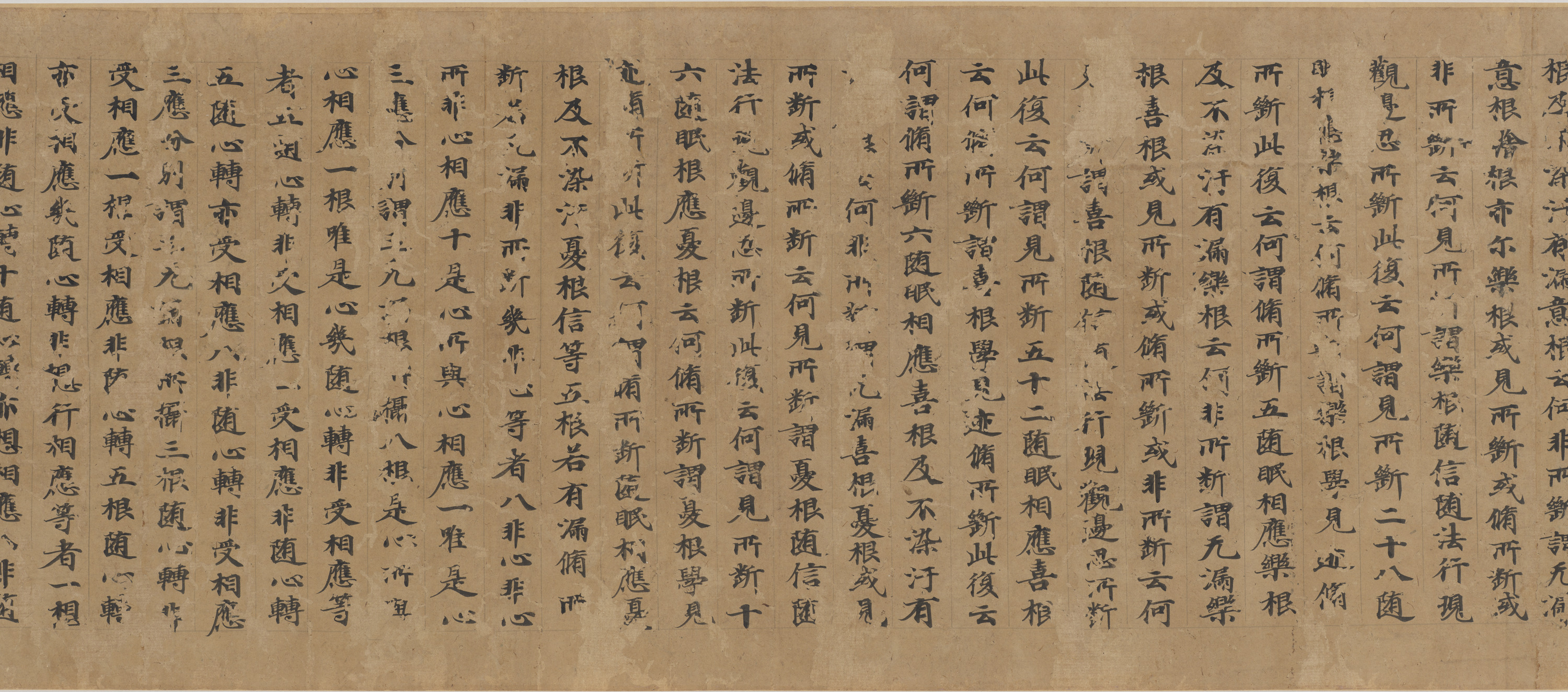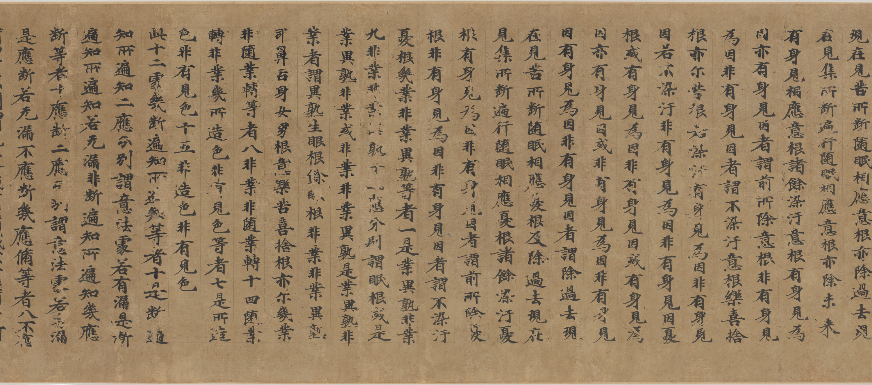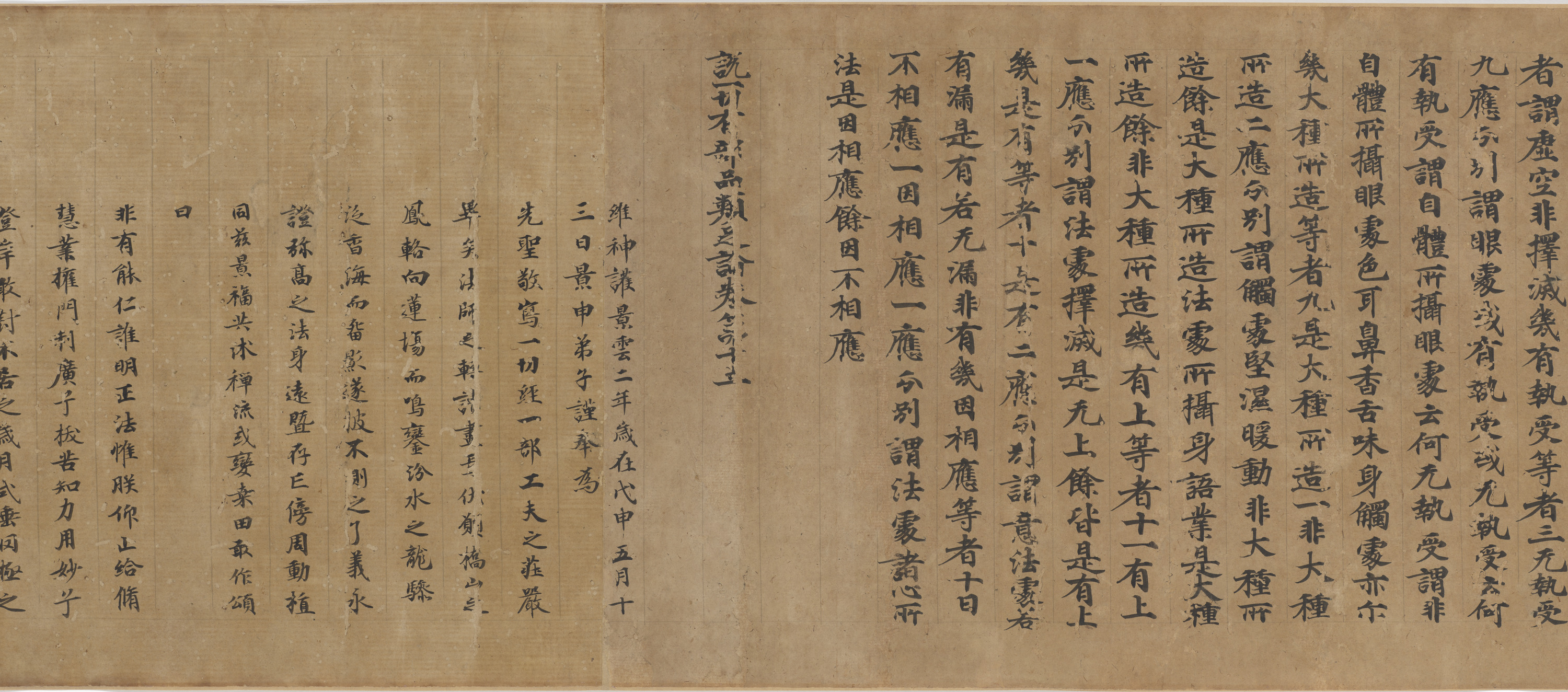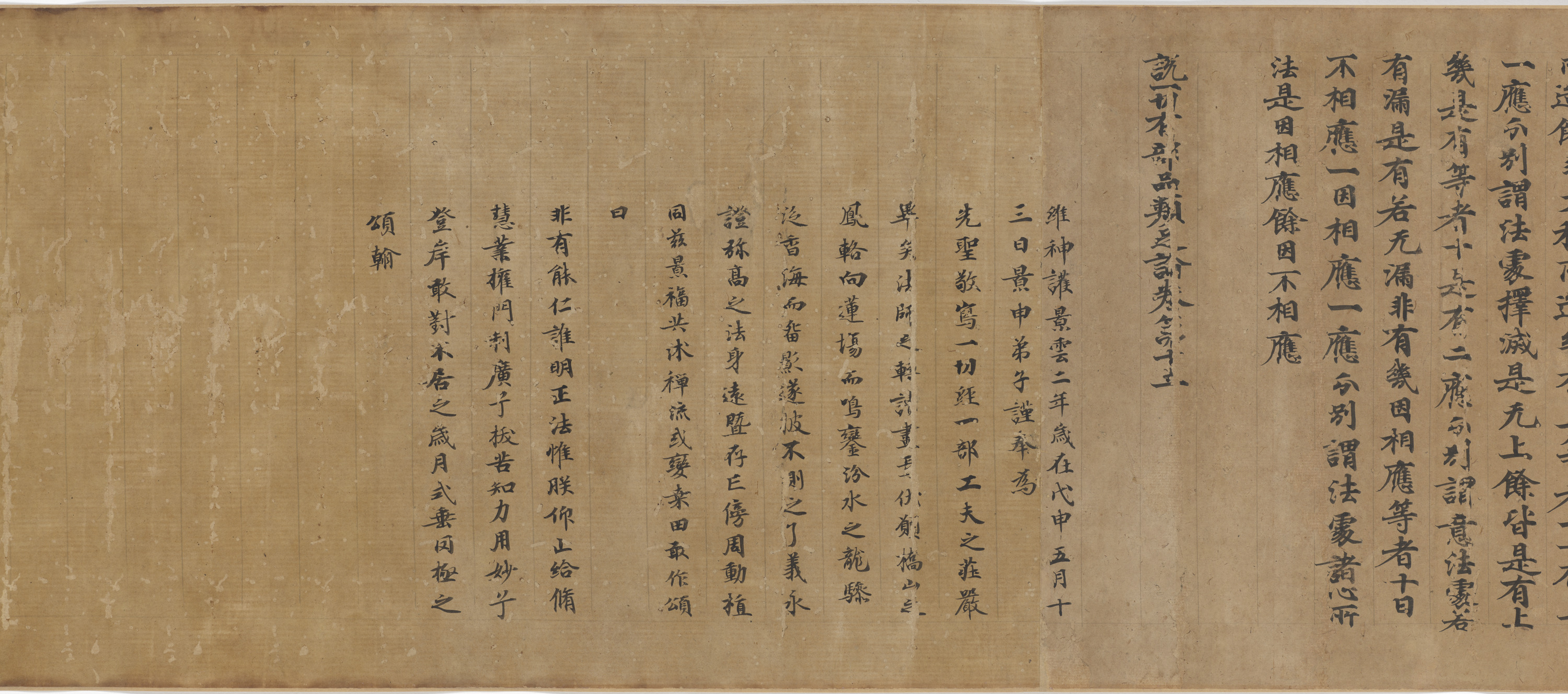 称徳天皇(七一八~七〇)が先帝、聖武天皇の追善のために発願し、天平宝字六年(七六二)から神護景雲四年(七七〇)にかけて書写させた一切経のうちの一巻。巻末に「神護景雲二年(七六八)五月十三日」付けの願文がみられることから、「神護景雲経」「称徳天皇御願経」と呼ばれる。願文の末尾に仏の功徳を褒め讃える偈頌(詩)が附されているのも珍しい。大ぶりで力強い筆致は奈良時代後期の写経の特徴とされる。