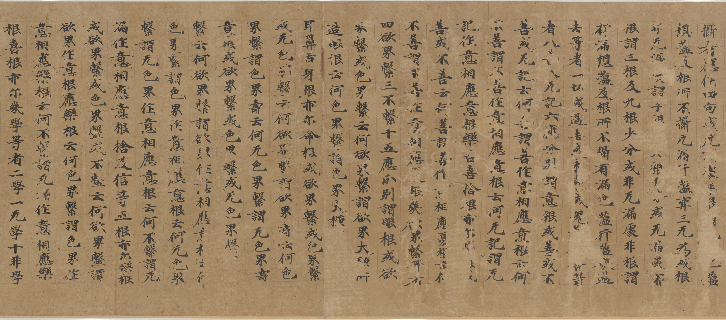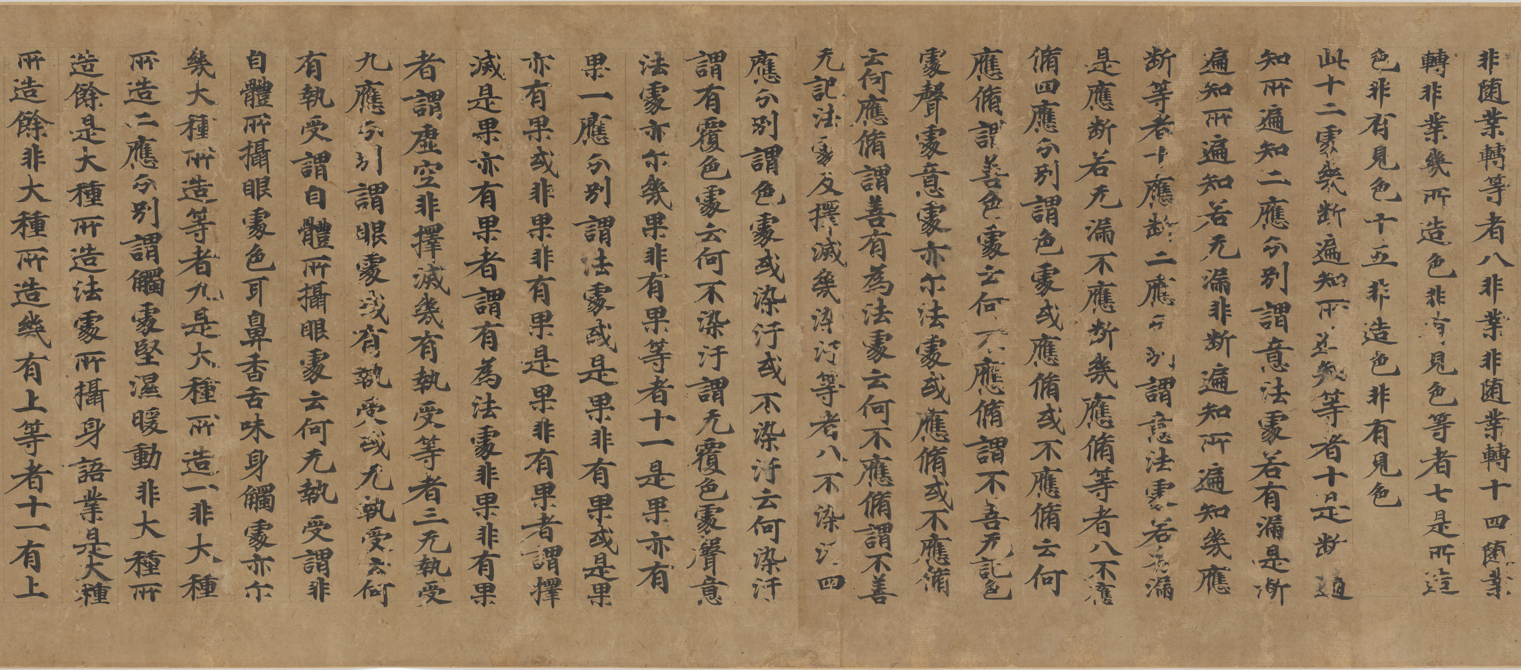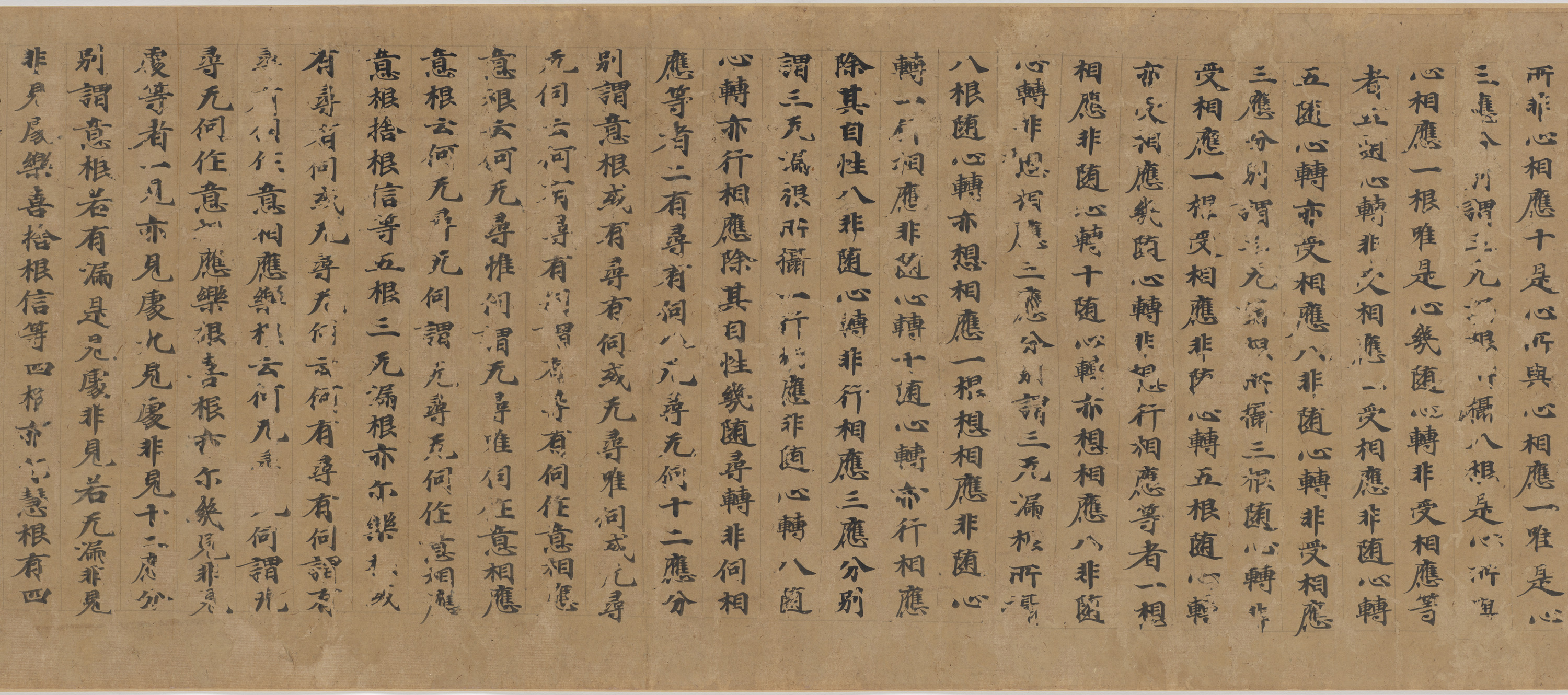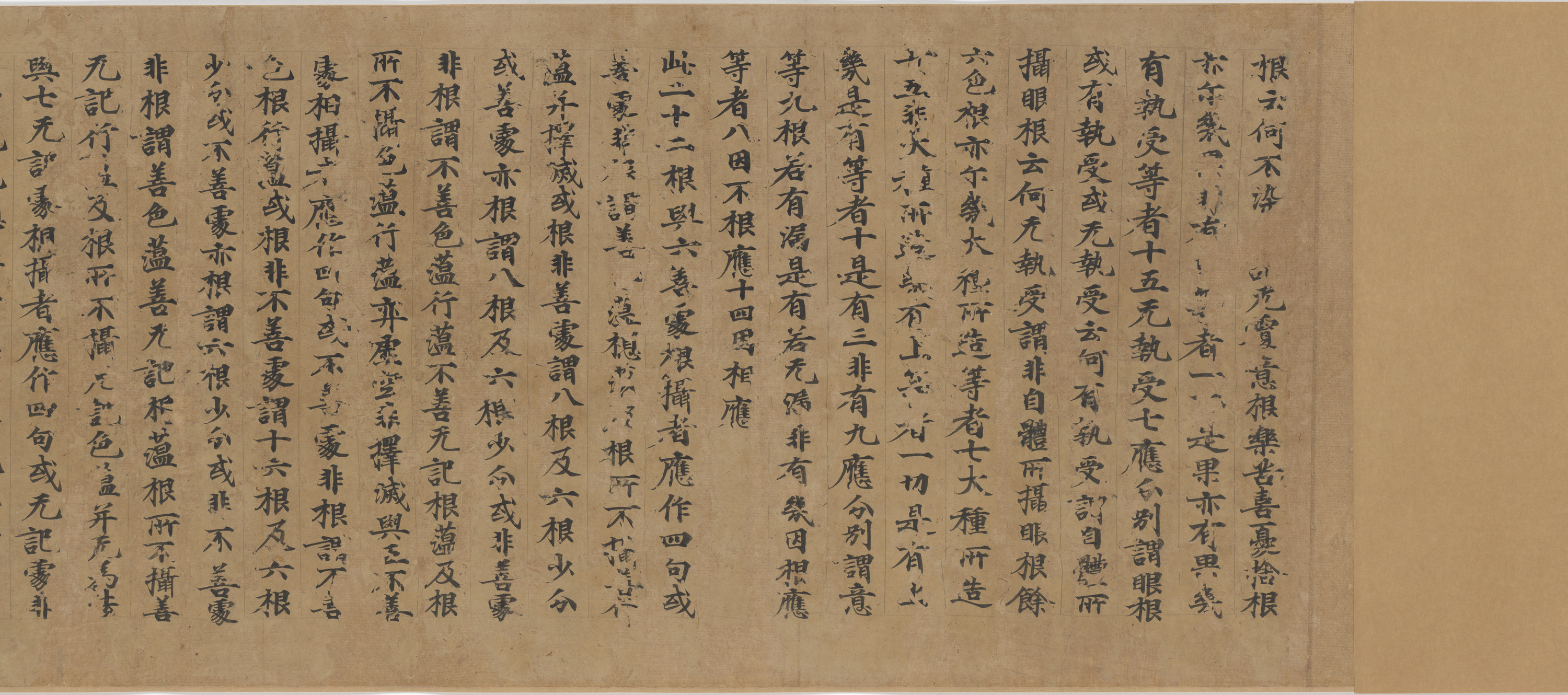 称徳天皇(七一八~七〇)が先帝、聖武天皇の追善のために発願し、天平宝字六年(七六二)から神護景雲四年(七七〇)にかけて書写させた一切経のうちの一巻。巻末に「神護景雲二年(七六八)五月十三日」付けの願文がみられることから、「神護景雲経」「称徳天皇御願経」と呼ばれる。願文の末尾に仏の功徳を褒め讃える偈頌(詩)が附されているのも珍しい。大ぶりで力強い筆致は奈良時代後期の写経の特徴とされる。