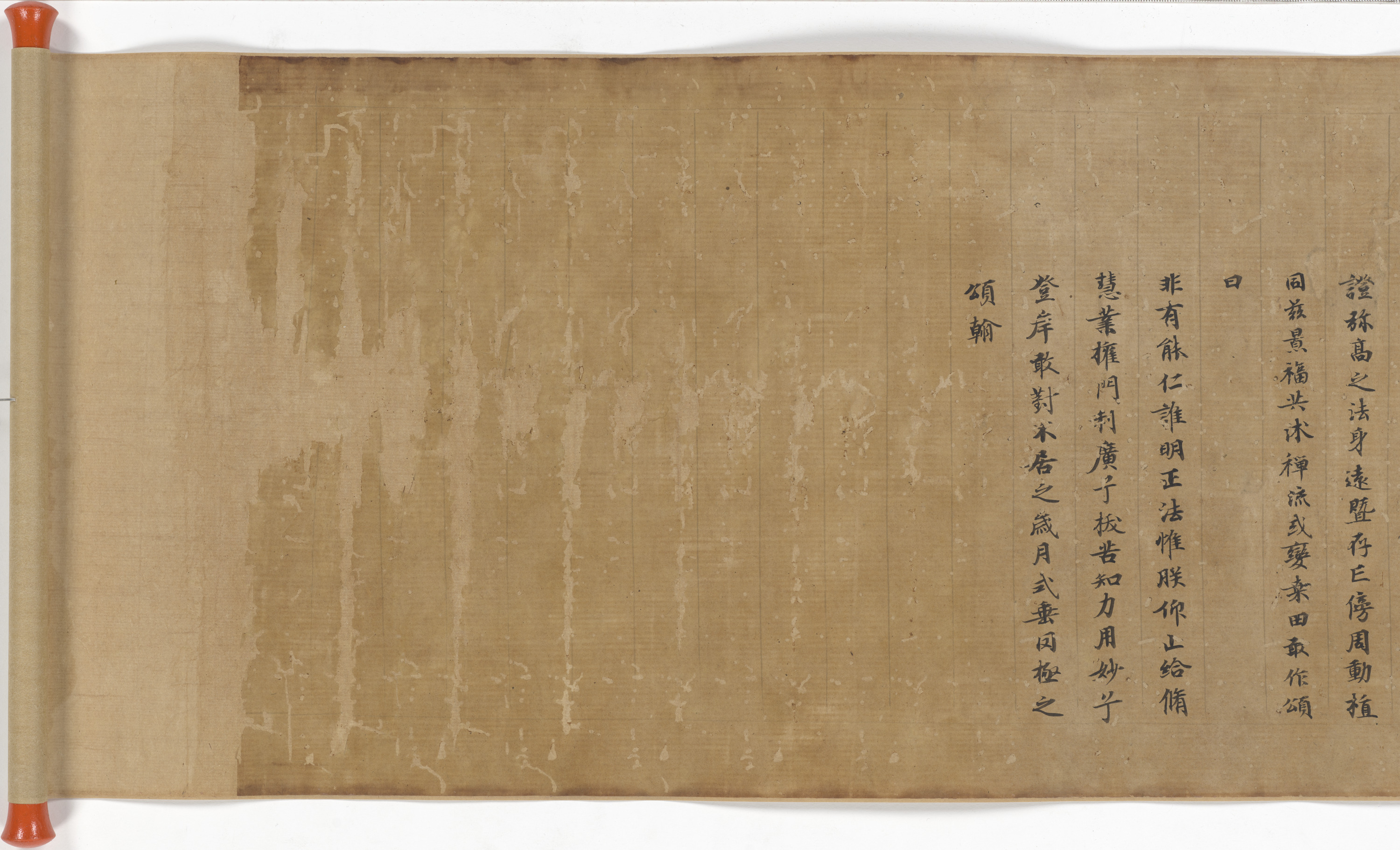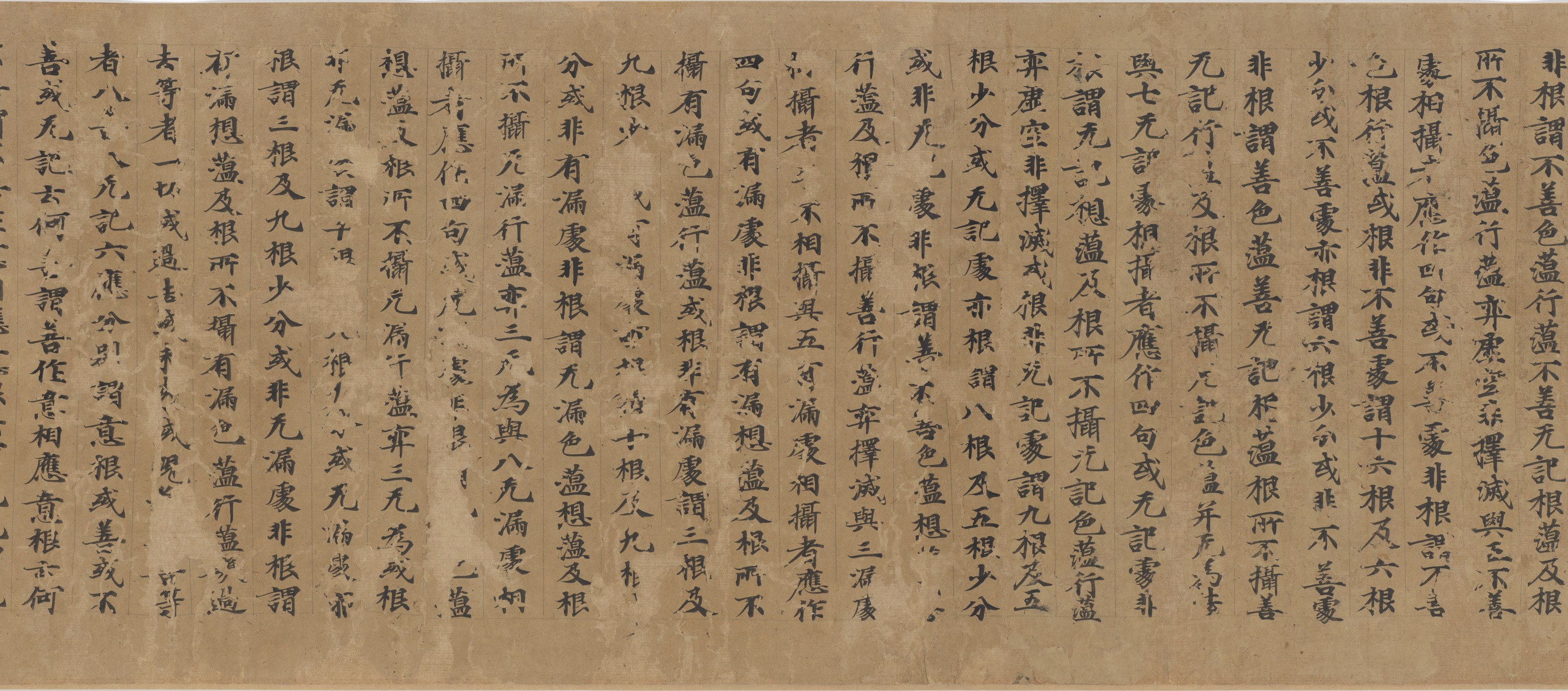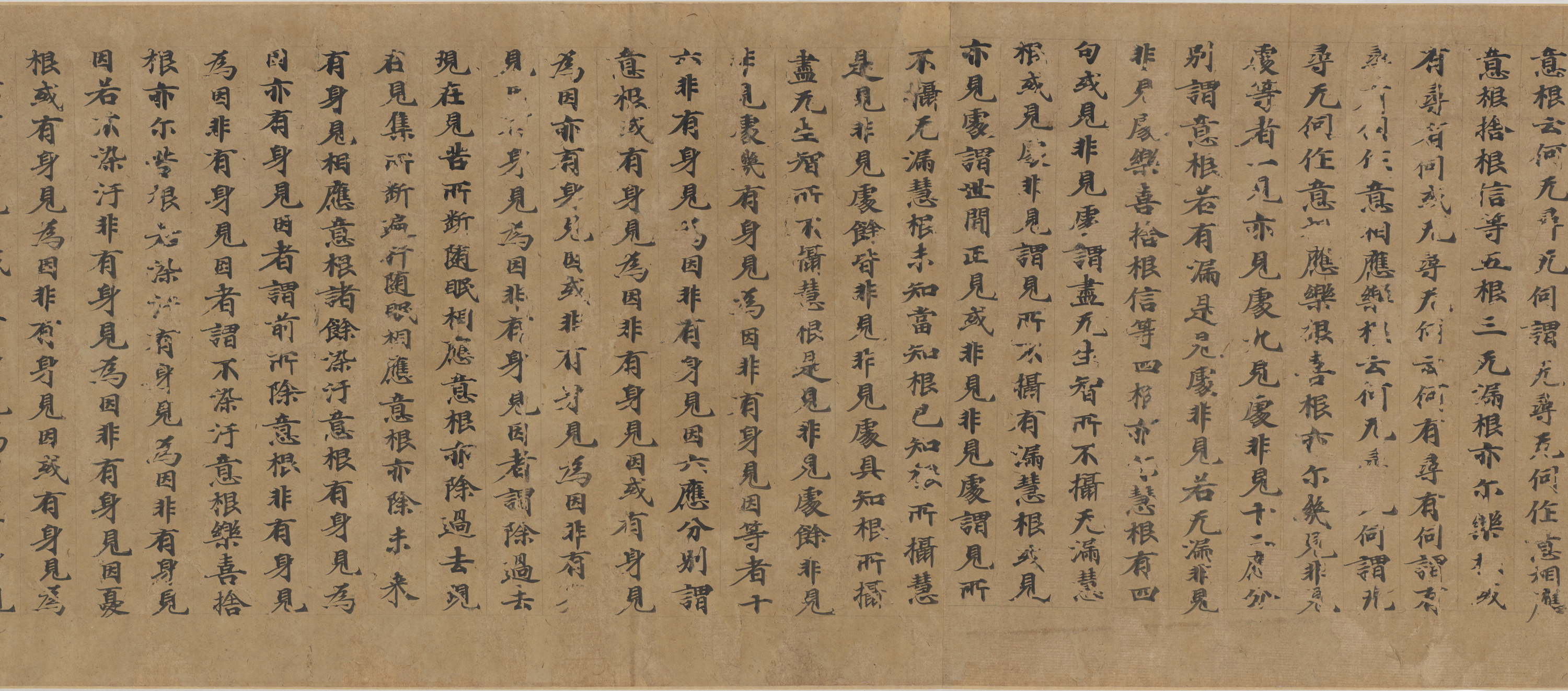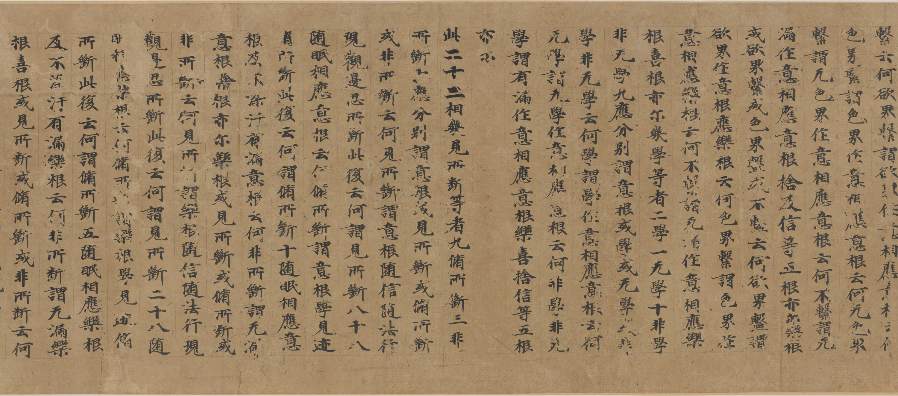 称徳天皇(七一八~七〇)が先帝、聖武天皇の追善のために発願し、天平宝字六年(七六二)から神護景雲四年(七七〇)にかけて書写させた一切経のうちの一巻。巻末に「神護景雲二年(七六八)五月十三日」付けの願文がみられることから、「神護景雲経」「称徳天皇御願経」と呼ばれる。願文の末尾に仏の功徳を褒め讃える偈頌(詩)が附されているのも珍しい。大ぶりで力強い筆致は奈良時代後期の写経の特徴とされる。