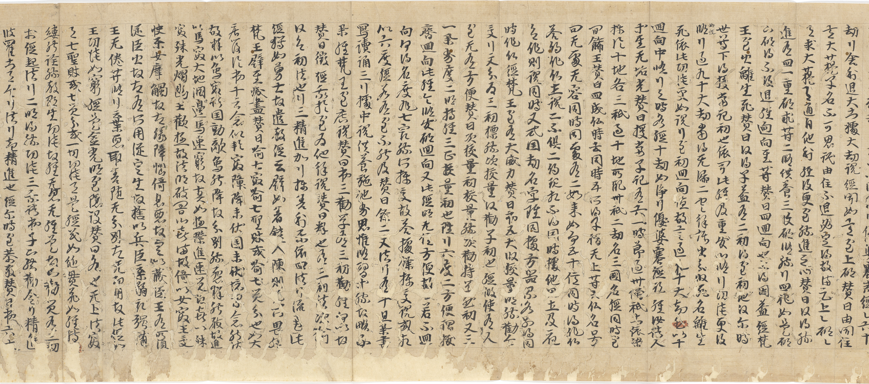 義浄(六三五~七一三)訳『金光明最勝王経』を、慧沼(六四八~七一四)が注釈したもの。奥書によれば貞観元年(八五九)、東大寺僧済雄による書写本。書写の功徳が目的とされる写経は、通常一行十七字詰で写経体と呼ばれる楷書に近い書体で丁寧に巻子に書写される。一方、教学研究が目的である本書の書写は、一行二十二字前後を草書で折本に書写している。同じ九世紀の書写になる。