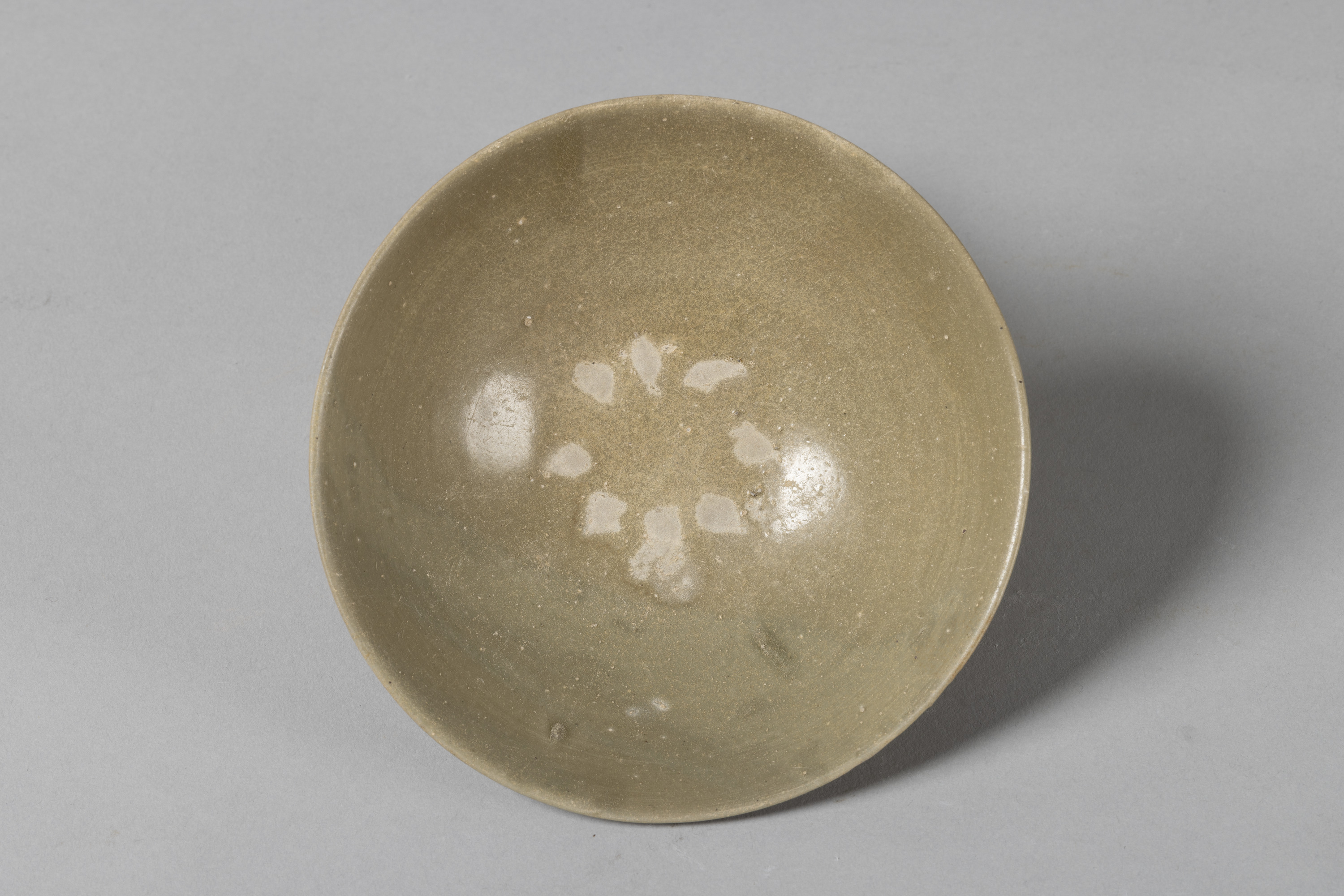 中国浙江省の越州窯系の窯で焼かれた青磁碗である。中国河北省の邢州窯系の窯で焼かれた白磁碗とともに、唐時代において喫茶用の茶碗として広く用いられていたものである。見込みに八つの目跡が残る。唐時代の茶書『茶経』にも青磁碗の記述がみられ、また青磁碗、白磁碗ともに日本にも持ち込まれており、平安京や大宰府など平安時代の遺跡からも同手青磁碗の出土がみられる。