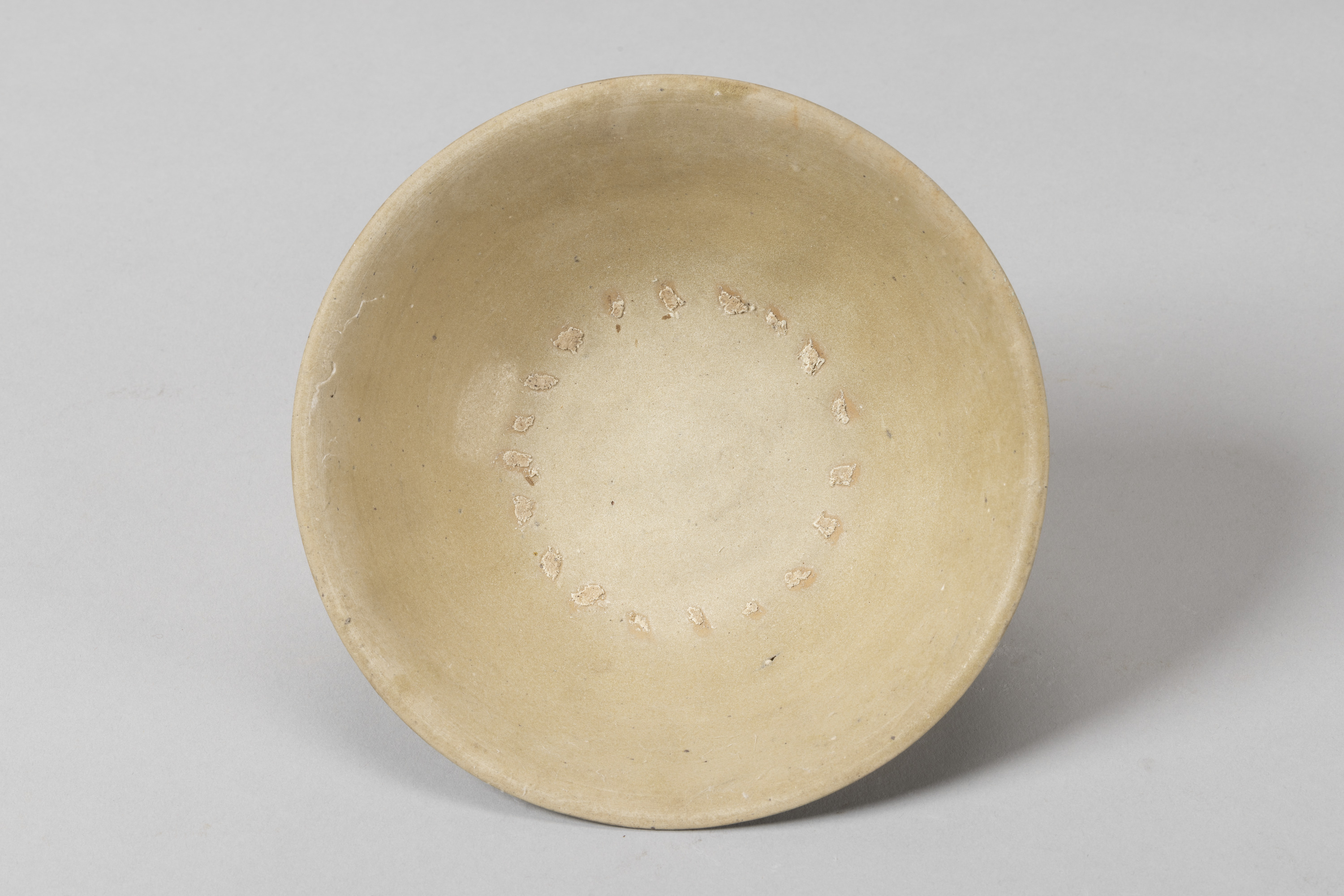 中国浙江省の越州窯系の窯で焼かれた青磁碗である。中国河北省の邢州窯系の窯で焼かれた白磁碗とともに、唐時代において喫茶用の茶碗として広く用いられていたものである。見込みには目跡が残り、重ね焼きがされたものであることがわかる。青磁碗、白磁碗ともに日本にも持ち込まれており、平安京や大宰府など平安時代の遺跡からも同手青磁碗の出土がみられる。