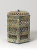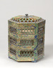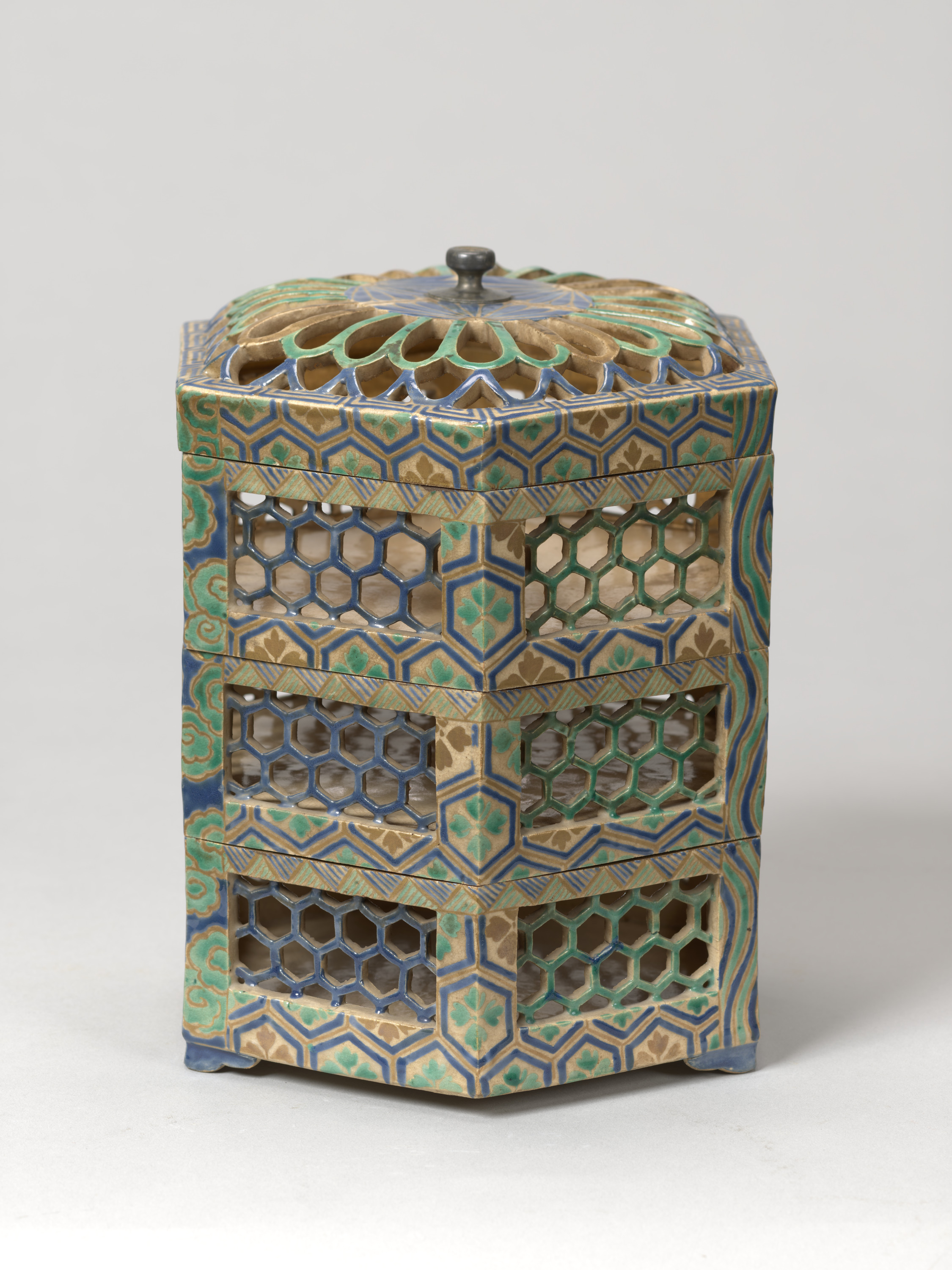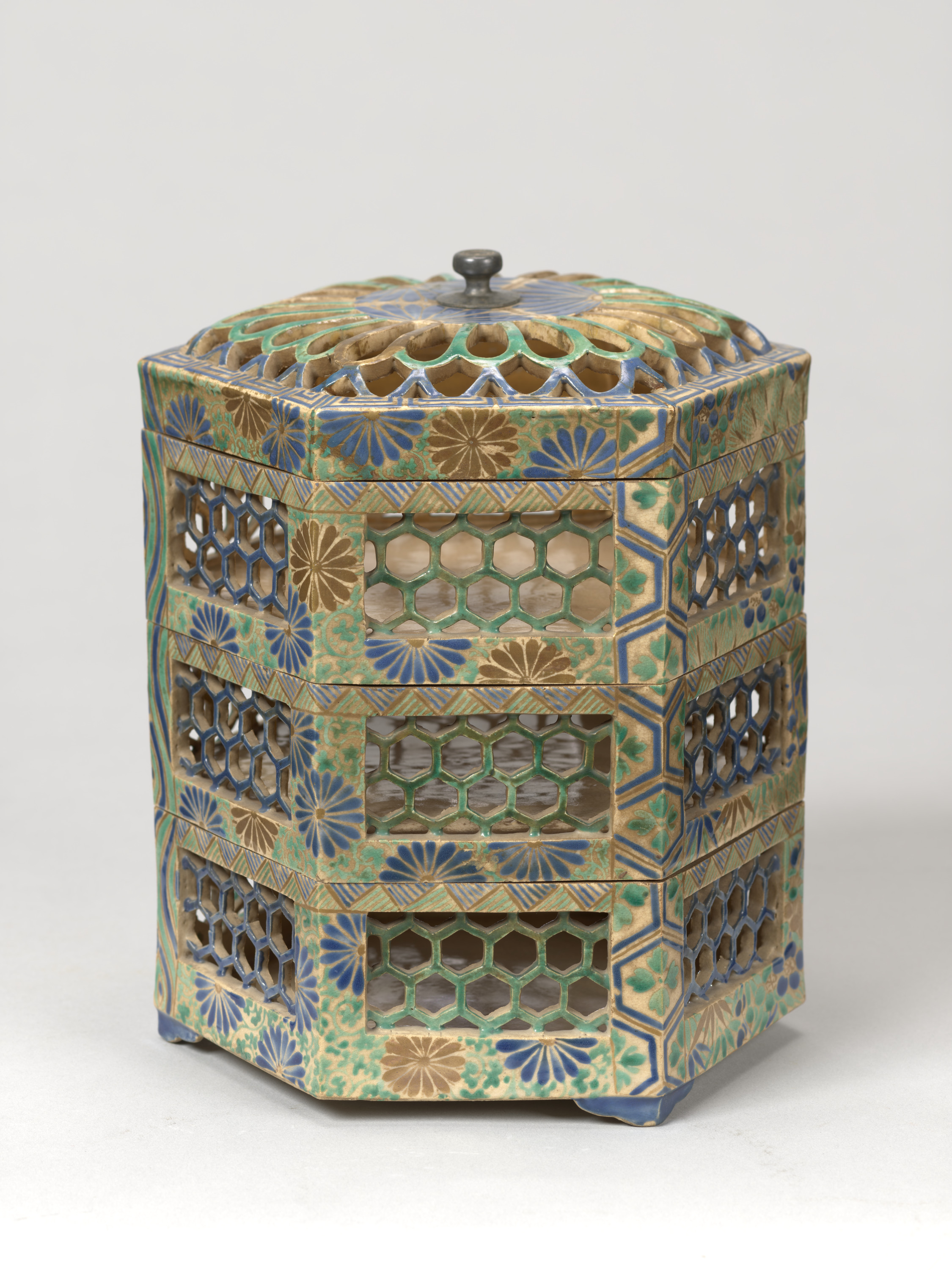 青と緑、そして金の三色ではあるが、多彩な様子に仕上げられた色絵金彩の段重。いわゆる古清水とよばれるもので、透かし彫りを行い虫籠形に仕上げている。内側に金彩が施され、下段には三つの脚が付けられている。底裏に判読不明であるが墨書がみられる。京焼の中でも代表的な形状のもので、当館に所縁のある上田堪一郎氏旧蔵。