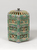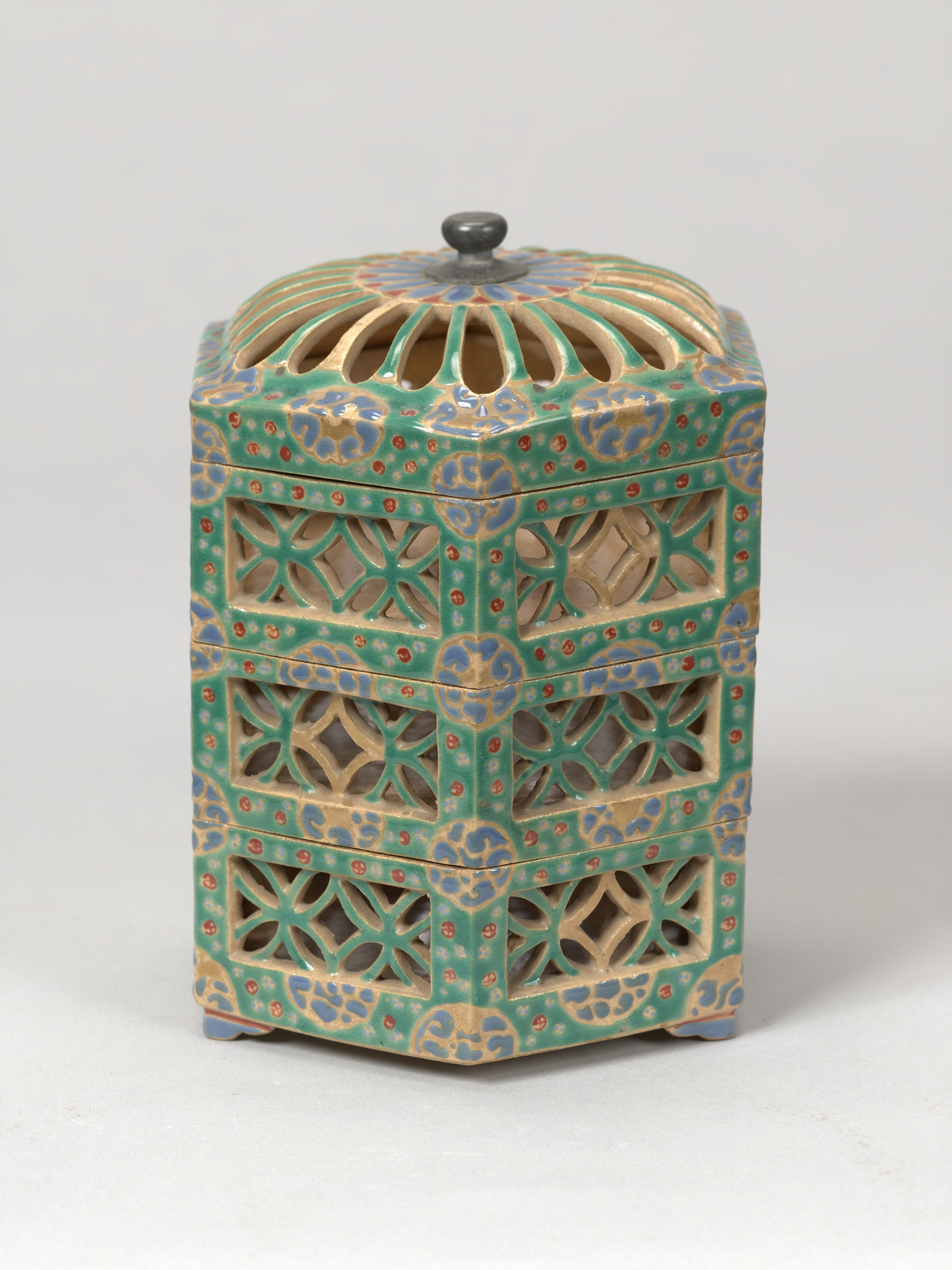 前述の色絵金彩段重と同タイプであるが、やや小ぶりとなるもの。虫籠をモチーフにしたものであるが、形状に大小あることがわかることも貴重である。赤絵が施されており、その鮮やかな色調や青と緑の色絵が基調となっており、京都市内における出土事例などからも18世紀末から19世紀にかけて作られたものと考えられる。当館に所縁のある上田堪一郎氏旧蔵。