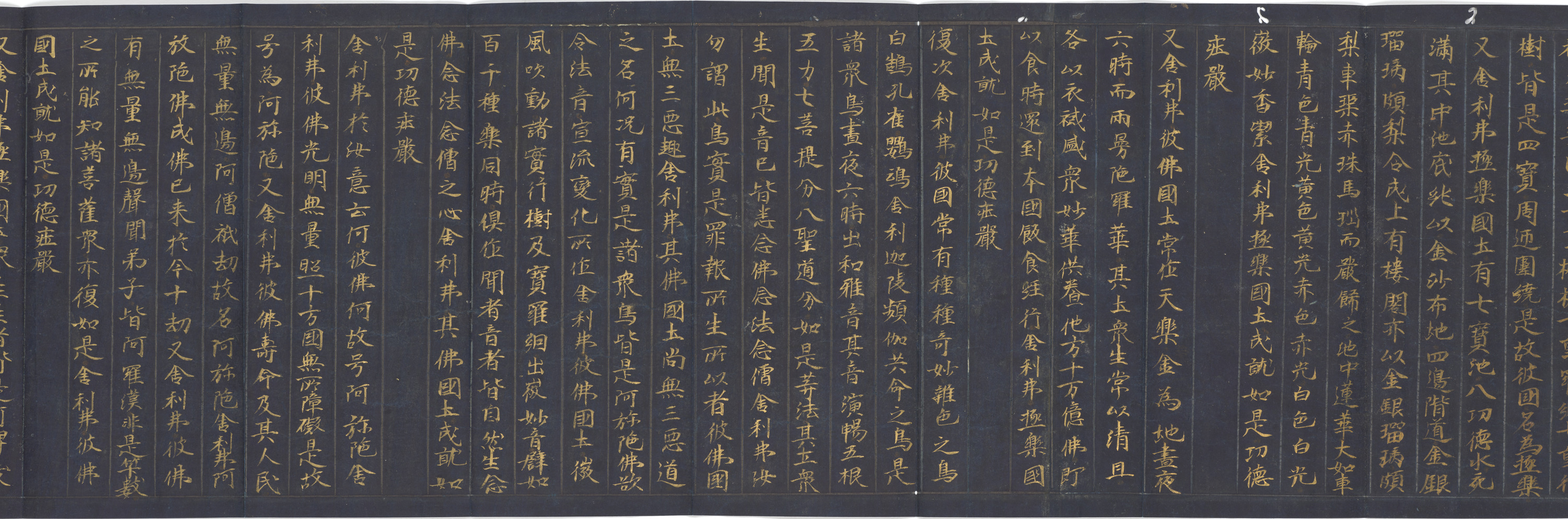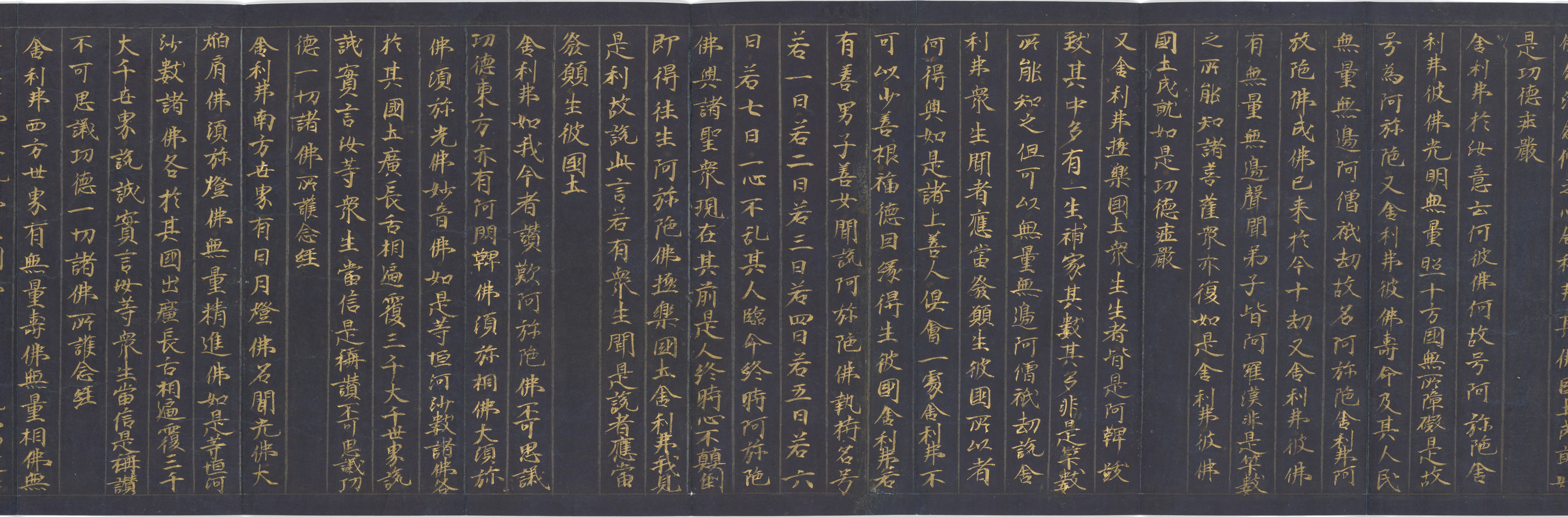 平安時代後期に盛んに制作された紺紙金字の経典。経典名は、仏説阿弥陀経で姚秦(ようしん)の鳩摩羅什(くまらじゅう)の訳になる。いわゆる浄土三部経のひとつで、西方極楽浄土の様子を説き、念仏をすすめる内容を持つ。当初は巻子装で表紙などもあったと思われるが、現在それらは失われ、天地も上下がやや断たれているのが惜しまれる。