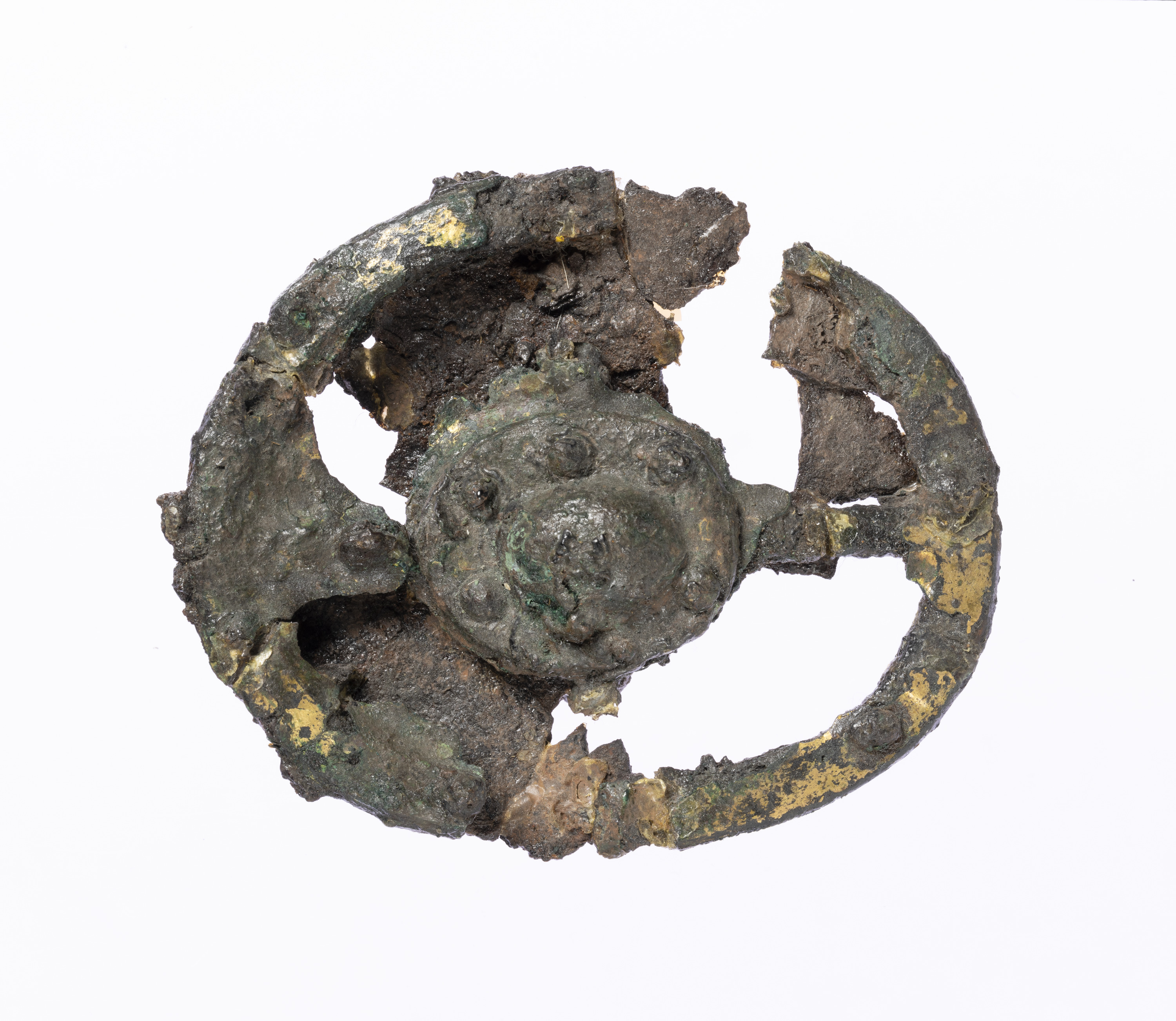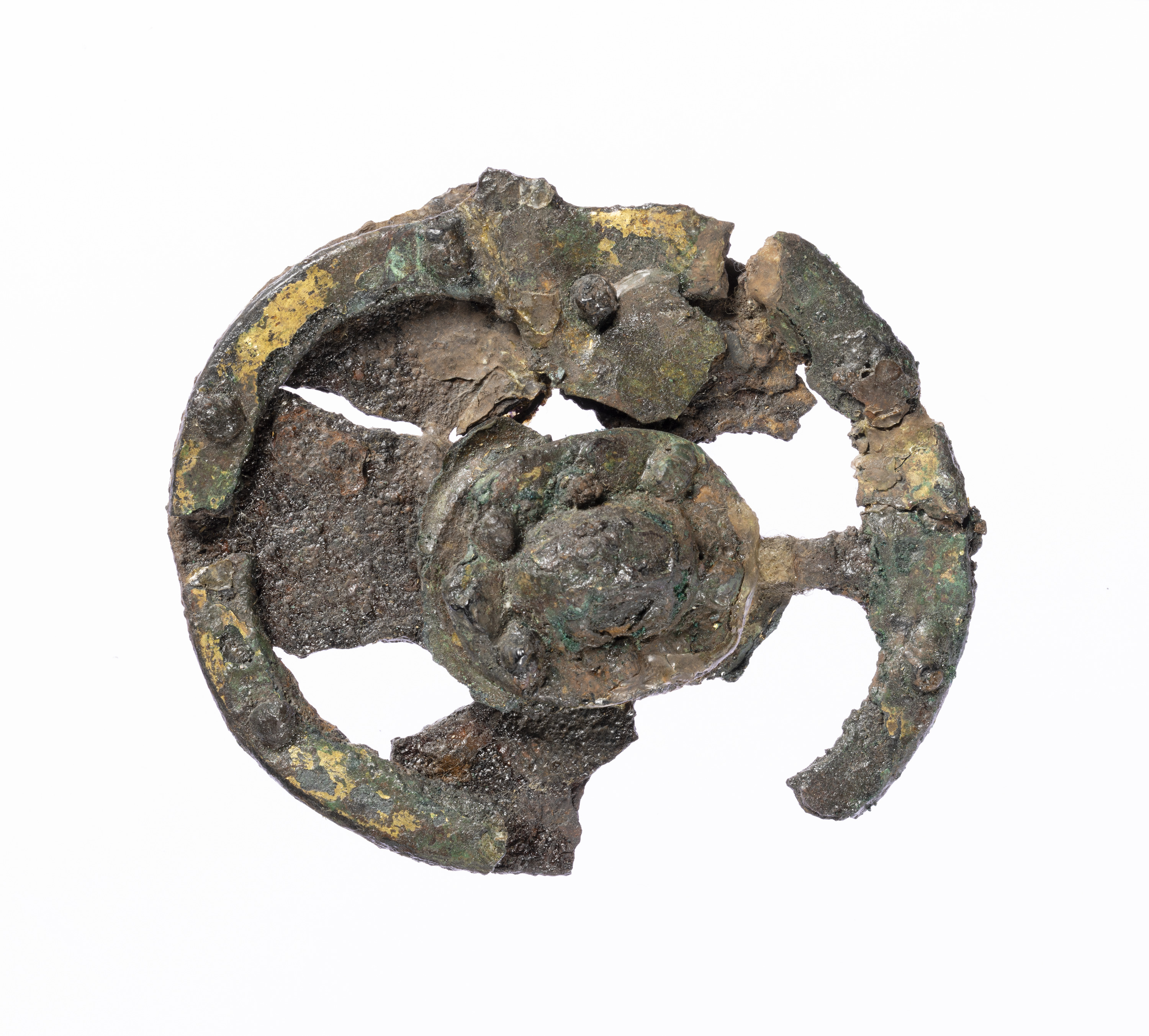 These artifacts were found in the Benzai Tumulus No. 1, which belongs to the Maki Burial Mounds in Fukuchiyama City, Kyoto Prefecture. This 5-meter tall, 20-meter long, round tumulus has atop its mound a shrine dedicated to the Buddhist deity Benzaiten (Skt., Saravati). The east side of a stone chamber was excavated by chance in 1955 (Shôwa 30) and artifacts were removed from within. The chamber was of relatively large size at 5.5 meters in length, 1.8 meters in width, and 2 meters in height. Because it was not an official archeological excavation, the exact position of these artifacts when excavated is unclear. They include a mirror with eight ornamental bells, gilt bronze bells, bridle bits, a harness pendant, horse trappings, weapons such as swords, spears, and arrowheads, and sueki ("underglazed earthenware") stem dishes and long-necked jars. Four sets of bridle bits are particularly valuable. The tumulus was constructed around the late 6th or early 7th century, i.e., in the late Kofun period (ca. 250-ca. 600).