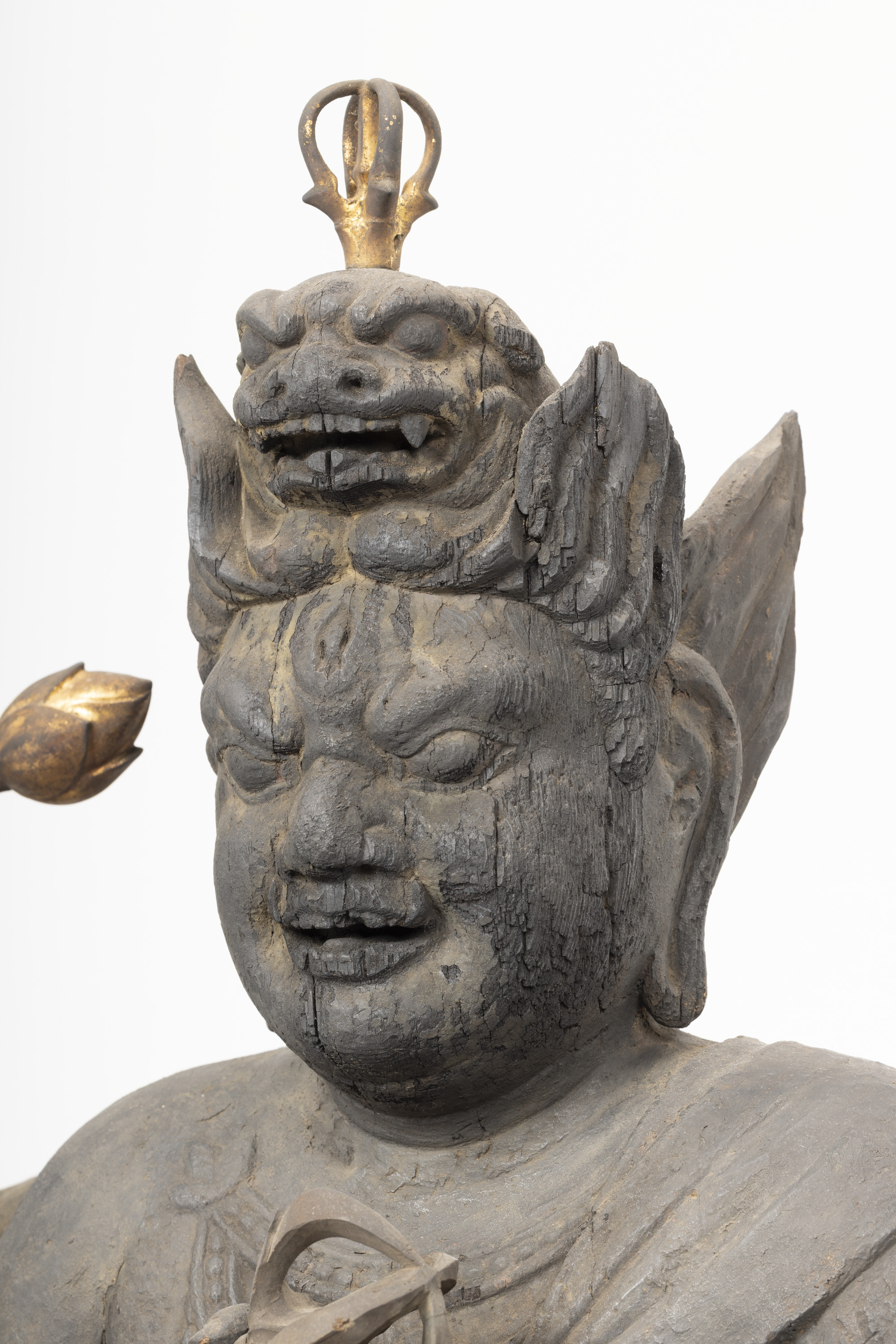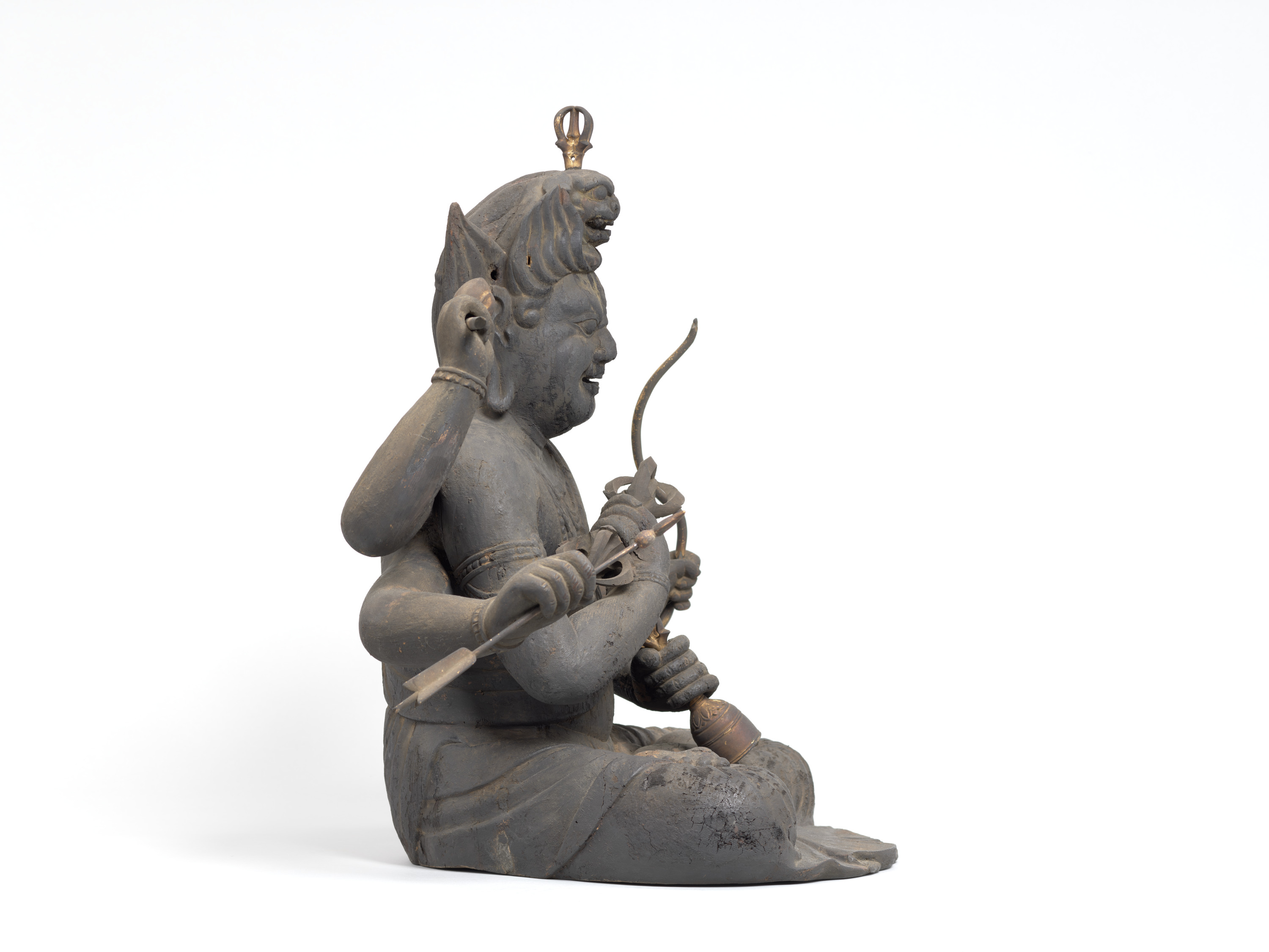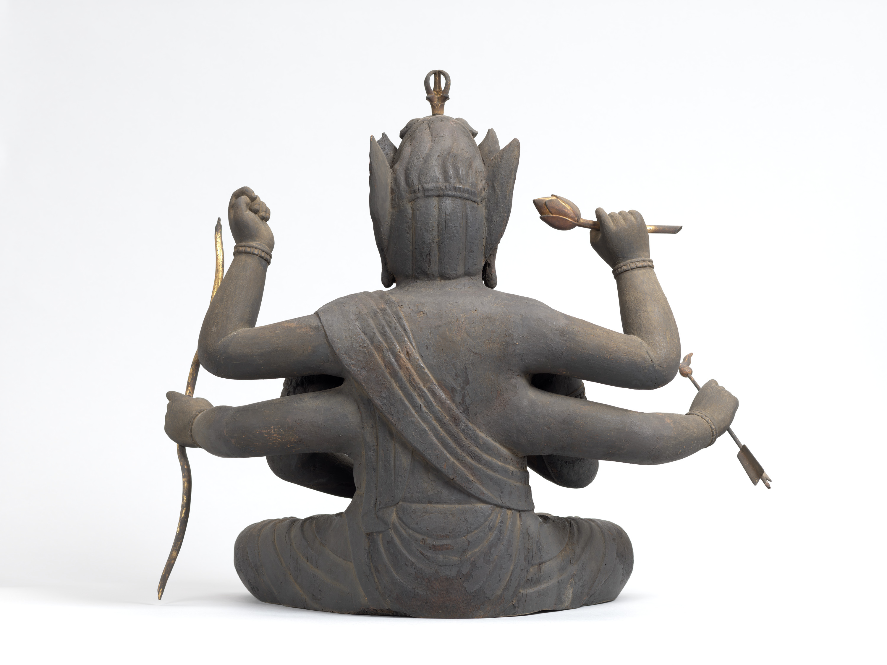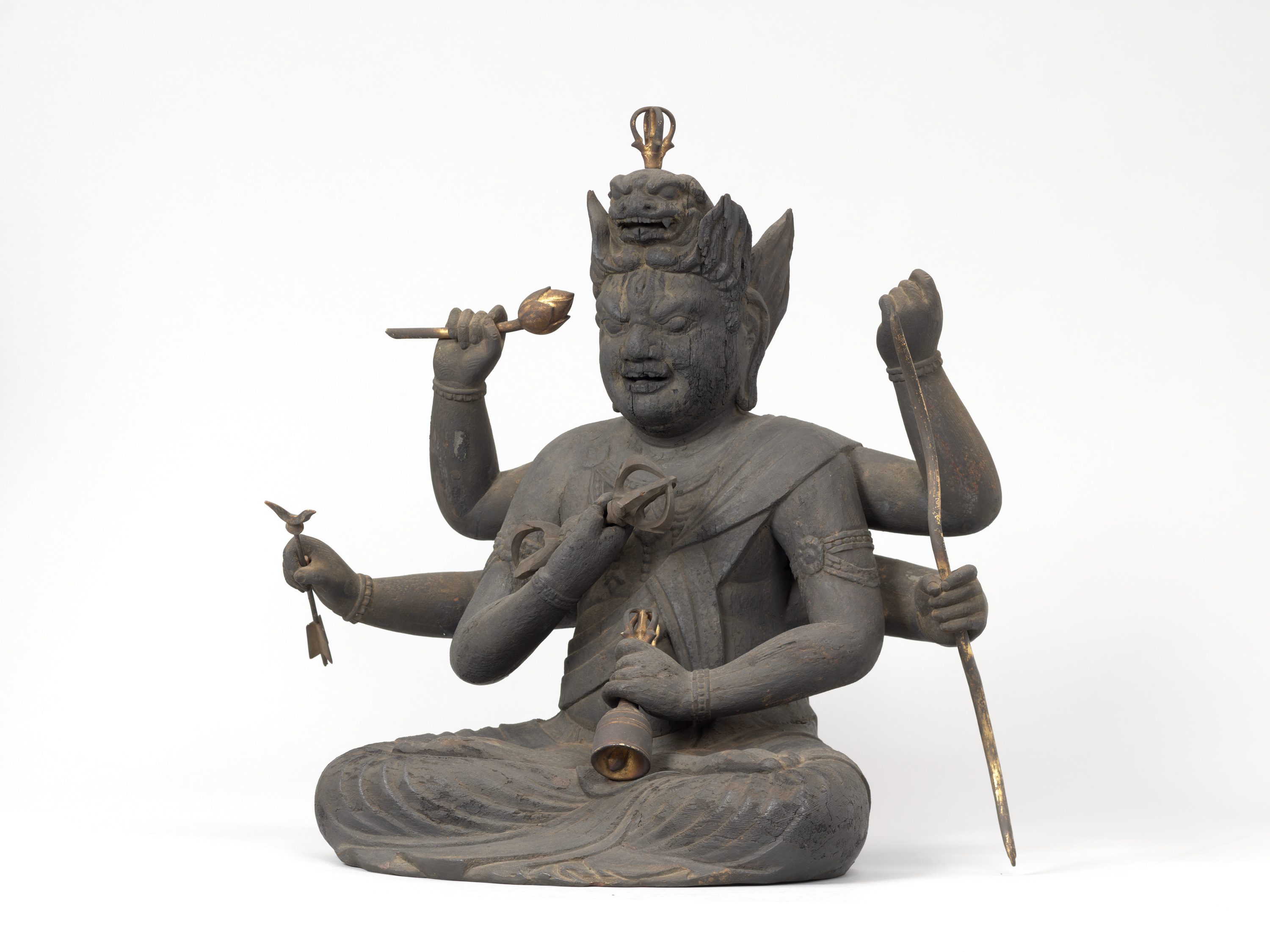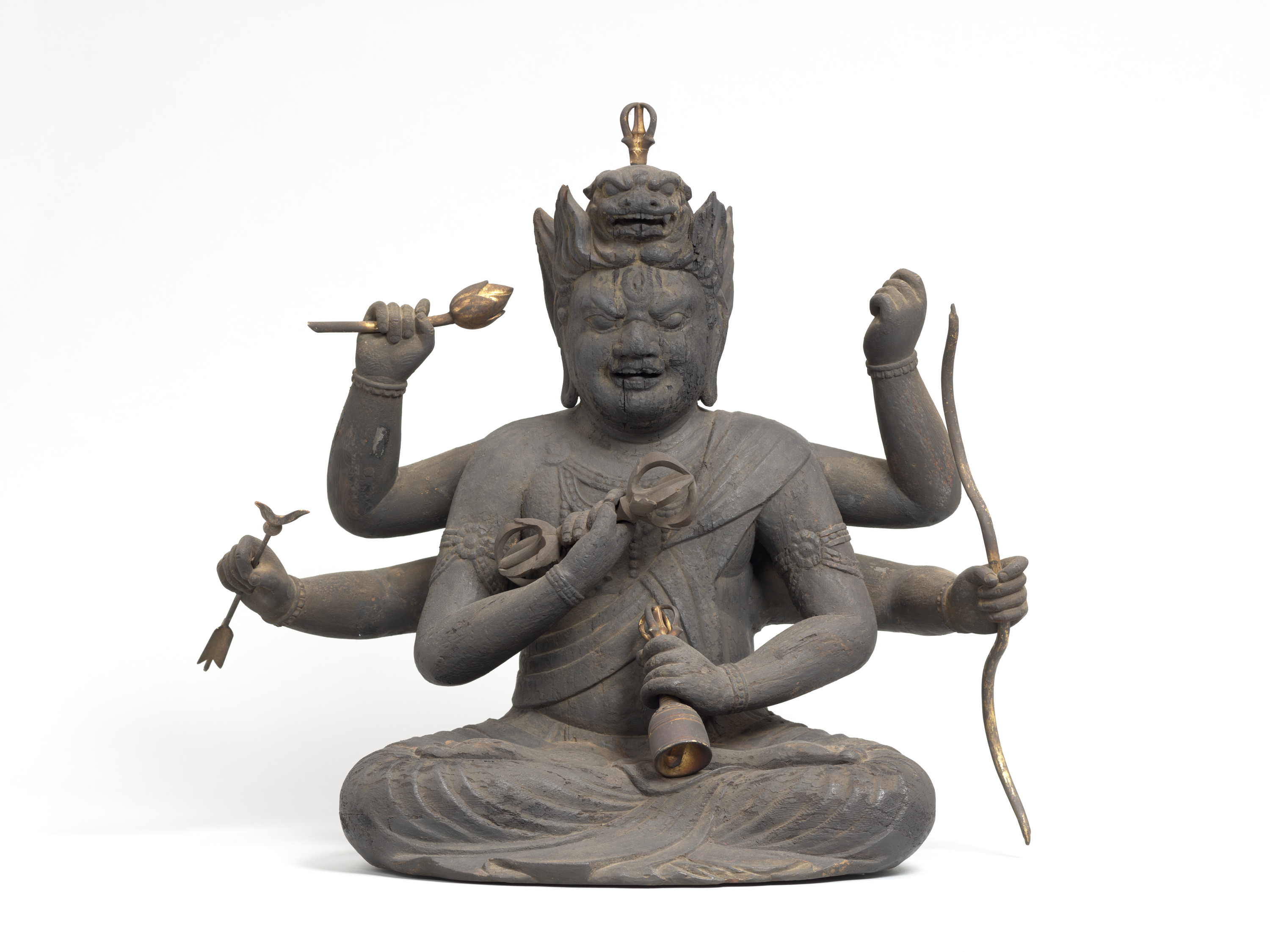 Aizen Myôô (Skt., Ragaraja) is a myôô ("radiant wisdom king") who diverts sexual desires to minds aspiring toward enlightenment. Images of Aizen Myôô are usually red, a color which represents sexual desire. The deity has three eyes and six arms, and wears a headpiece in the shape of a lion's head. In the late Heian period (794-1185), during which the role of esoteric Buddhism was transforming from one of keeping the peace and security of the nation to one of personal religion, the worship of Aizen Myôô became popular in the Imperial Court and among the aristocracy, especially after the Insei era (1086-1185), around the end of the 11th century. Although there are a number of records indicating the production of Aizen Myôô statues, there are very few examples remaining. The angry facial expression and the characteristic tranquil style of this piece suggest that it was produced in the late 12th century. It is a valuable work that features characteristics of the late Heian period.