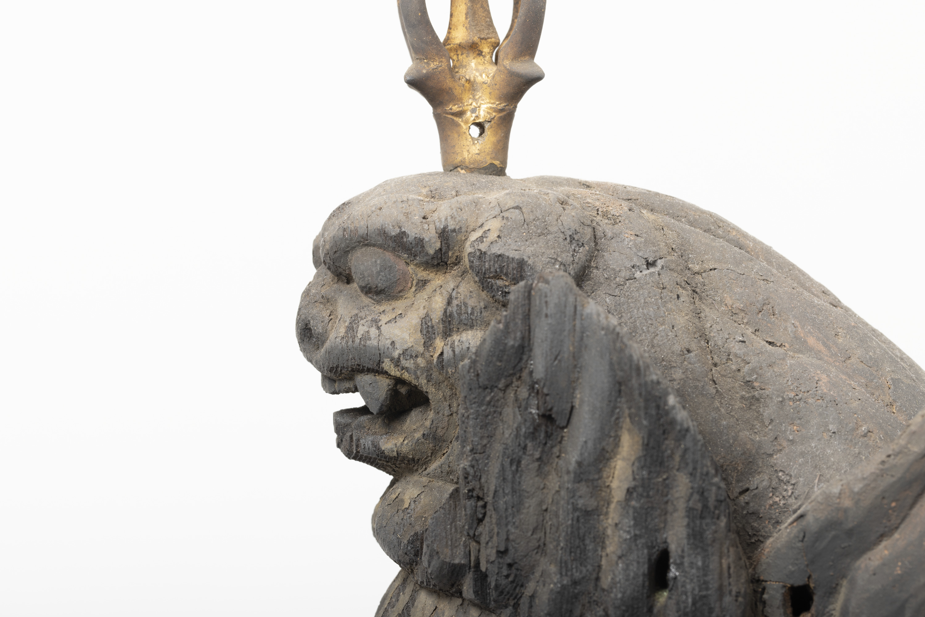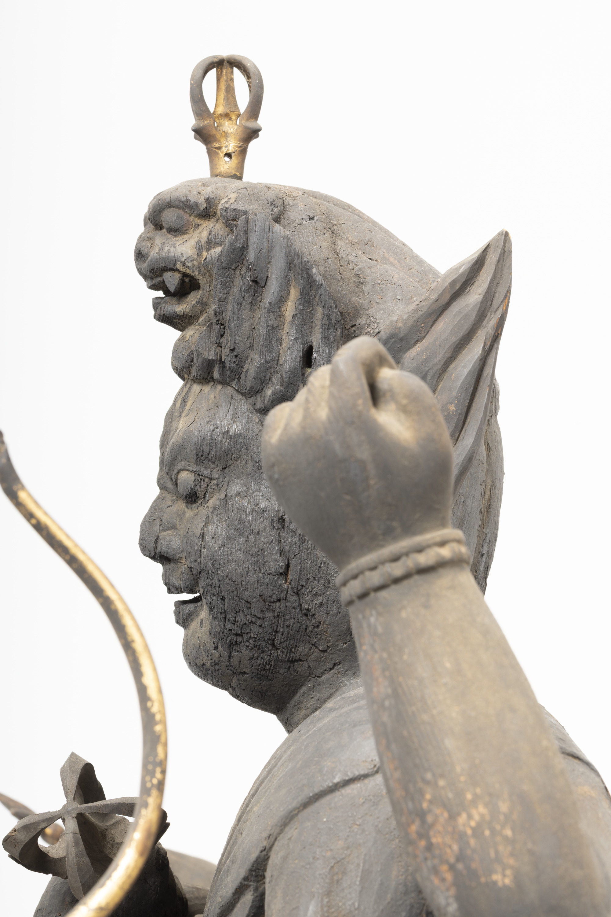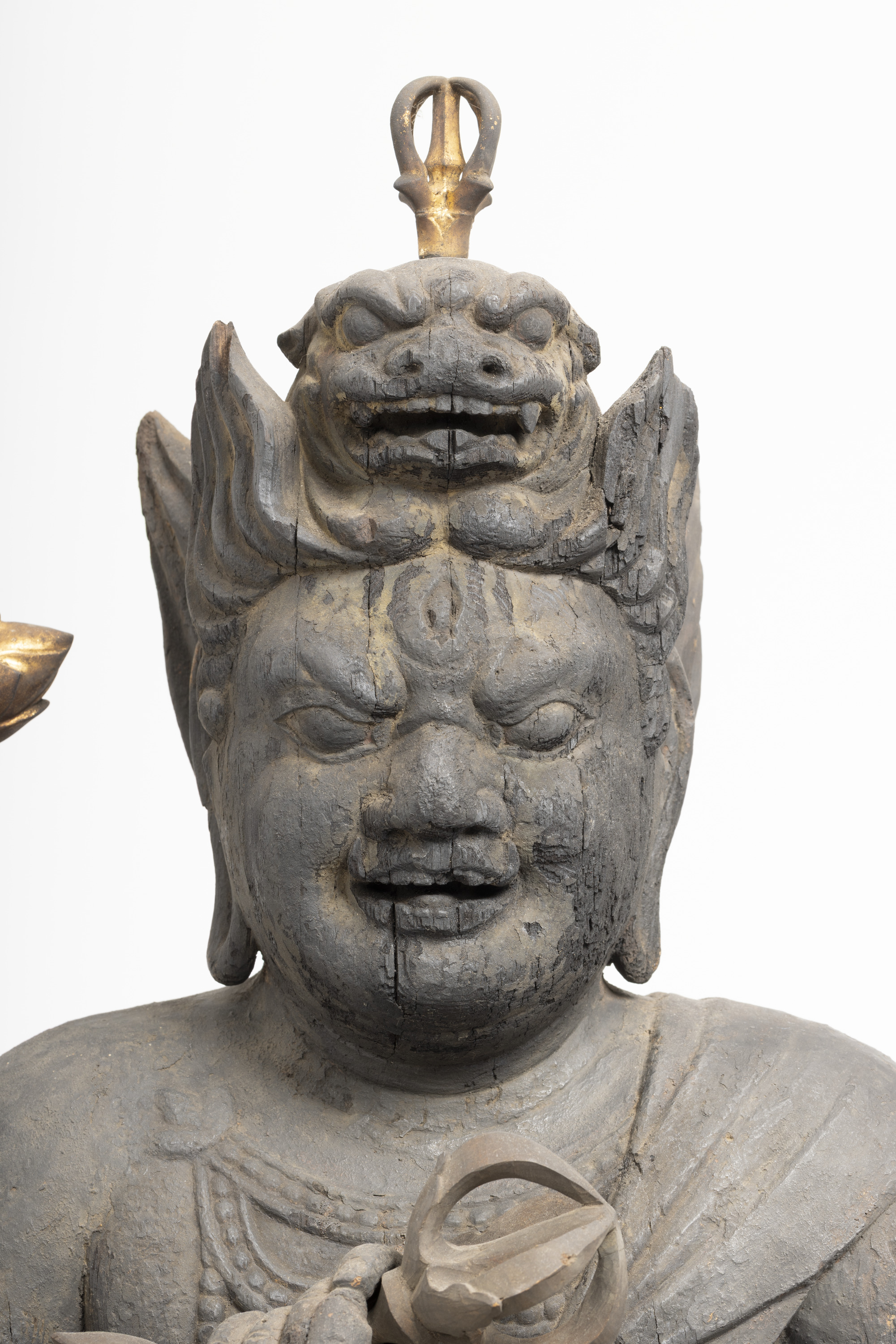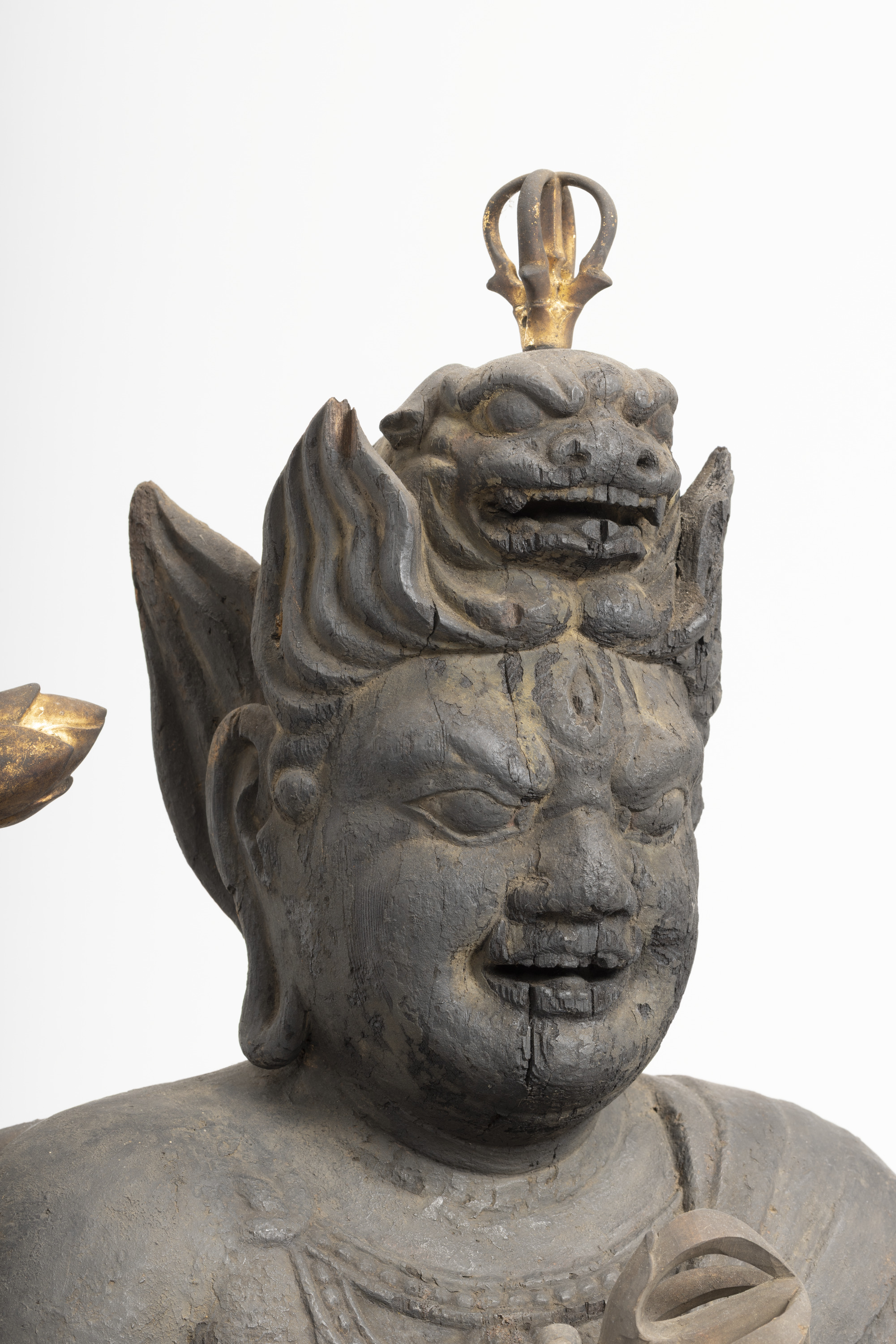 Aizen Myôô (Skt., Ragaraja) is a myôô ("radiant wisdom king") who diverts sexual desires to minds aspiring toward enlightenment. Images of Aizen Myôô are usually red, a color which represents sexual desire. The deity has three eyes and six arms, and wears a headpiece in the shape of a lion's head. In the late Heian period (794-1185), during which the role of esoteric Buddhism was transforming from one of keeping the peace and security of the nation to one of personal religion, the worship of Aizen Myôô became popular in the Imperial Court and among the aristocracy, especially after the Insei era (1086-1185), around the end of the 11th century. Although there are a number of records indicating the production of Aizen Myôô statues, there are very few examples remaining. The angry facial expression and the characteristic tranquil style of this piece suggest that it was produced in the late 12th century. It is a valuable work that features characteristics of the late Heian period.