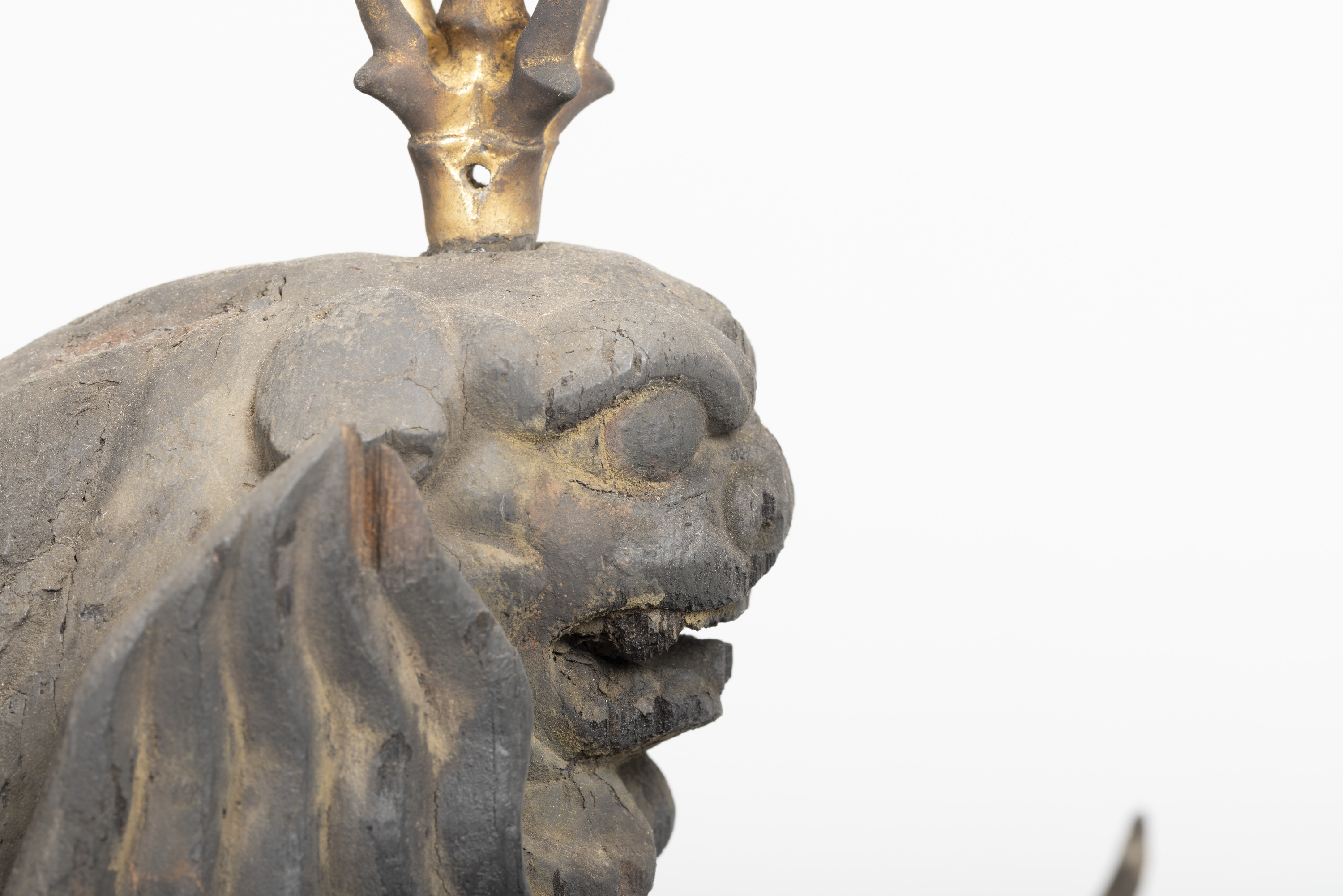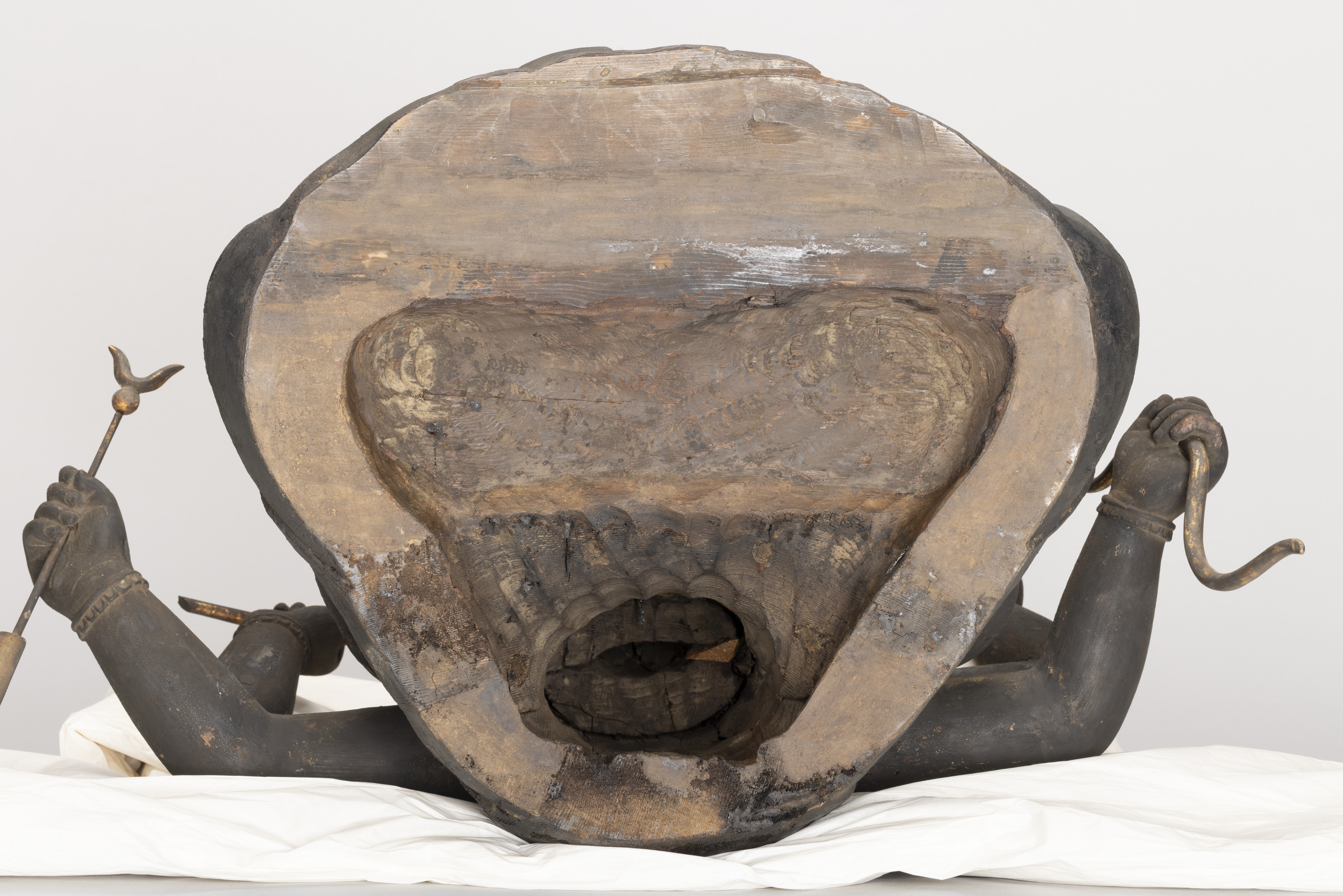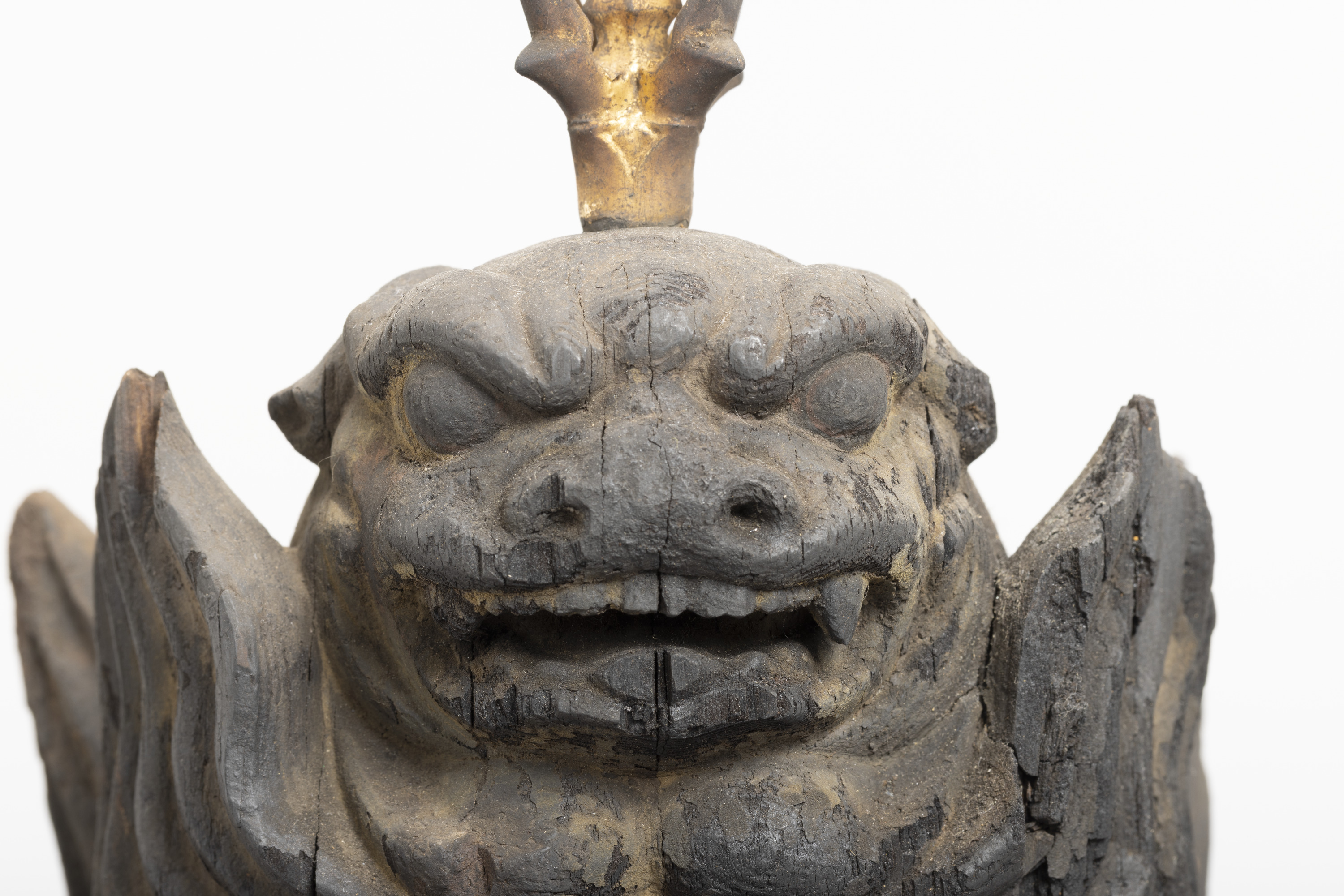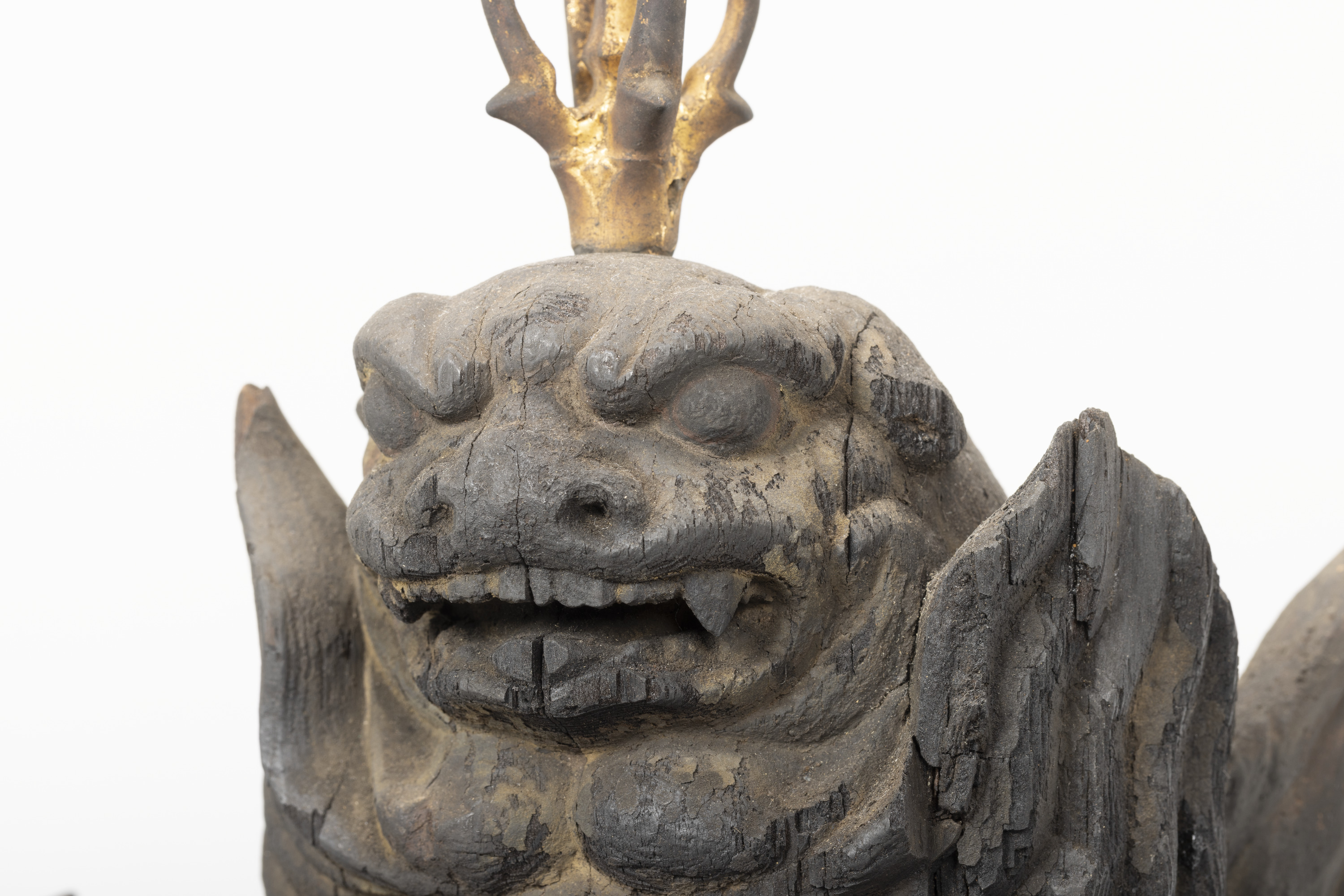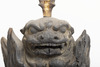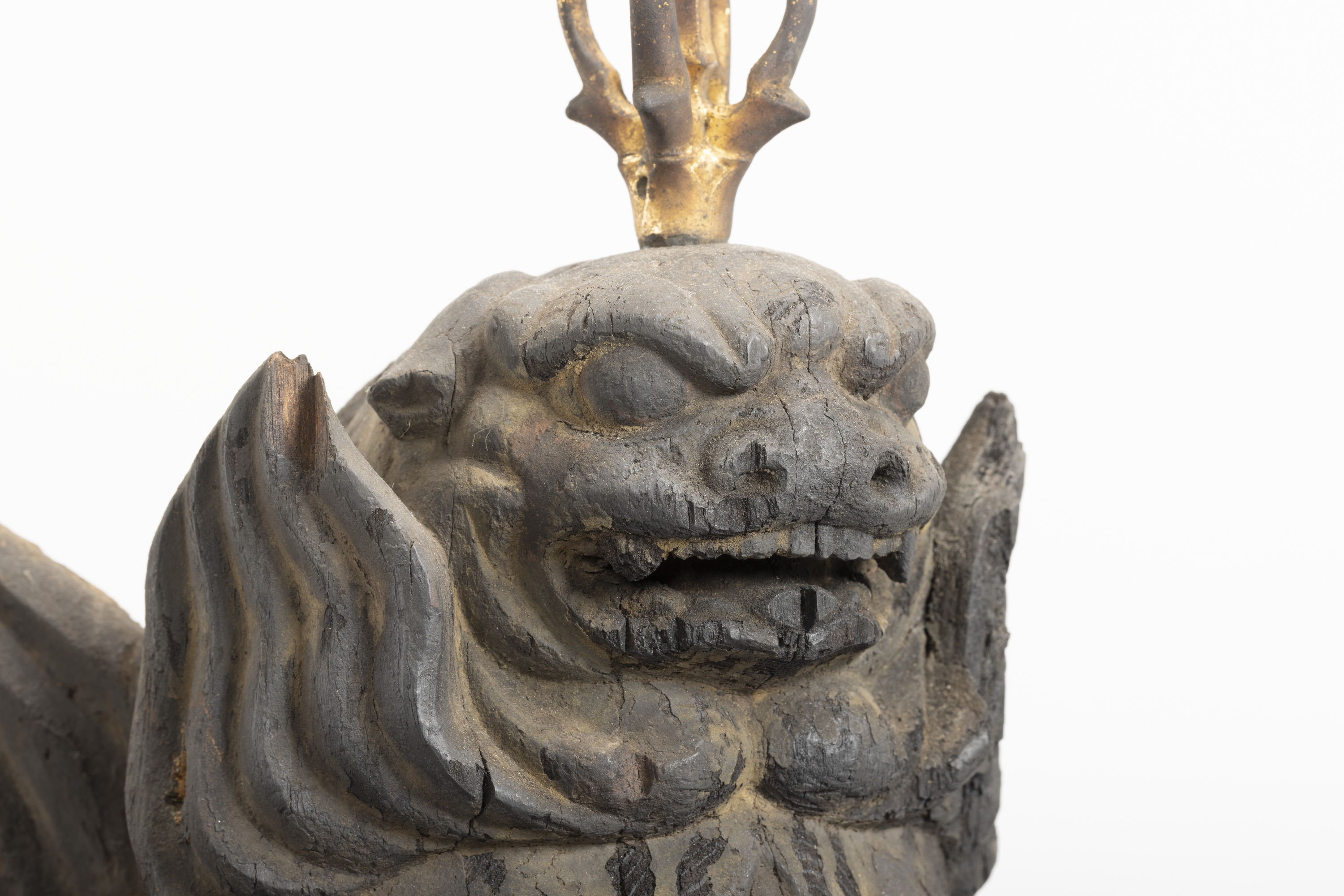 Aizen Myôô (Skt., Ragaraja) is a myôô ("radiant wisdom king") who diverts sexual desires to minds aspiring toward enlightenment. Images of Aizen Myôô are usually red, a color which represents sexual desire. The deity has three eyes and six arms, and wears a headpiece in the shape of a lion's head. In the late Heian period (794-1185), during which the role of esoteric Buddhism was transforming from one of keeping the peace and security of the nation to one of personal religion, the worship of Aizen Myôô became popular in the Imperial Court and among the aristocracy, especially after the Insei era (1086-1185), around the end of the 11th century. Although there are a number of records indicating the production of Aizen Myôô statues, there are very few examples remaining. The angry facial expression and the characteristic tranquil style of this piece suggest that it was produced in the late 12th century. It is a valuable work that features characteristics of the late Heian period.